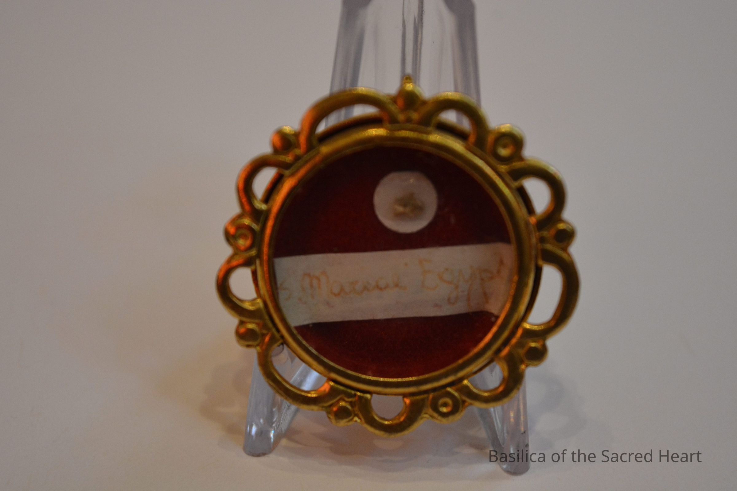 Bone relic of St. Mary of Egypt attached to a white, paper circle on red, fabric backing. Paper label reads "S. Mariae Egypt". All is contained in a round, brass theca.