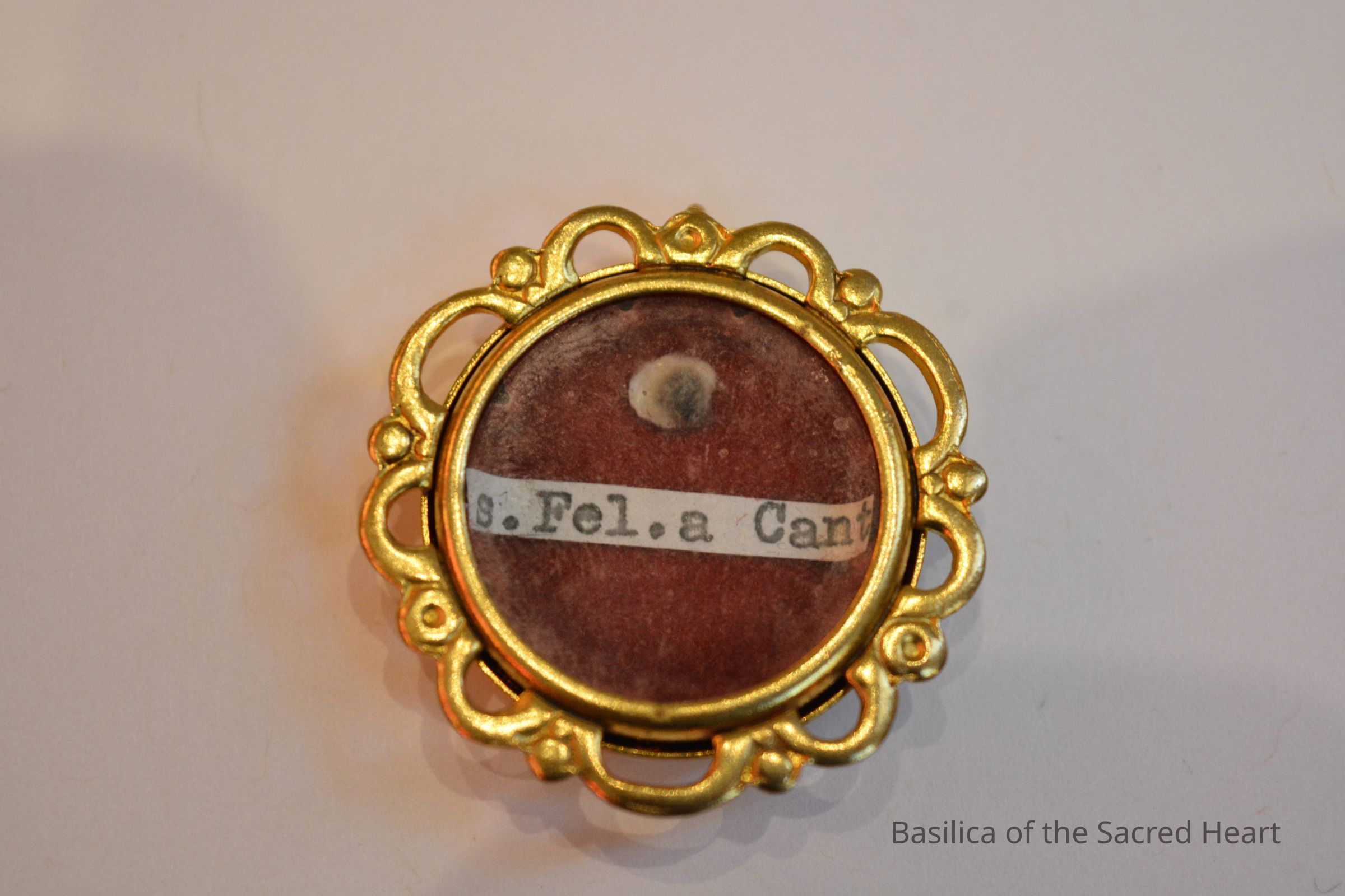 First Class relic of St. Felix of Cantalice. The relic is attached to a white spot of fabric on a red velvet backing. The paper label reads "s. Fel. a Cant". All is contained in a brass theca.