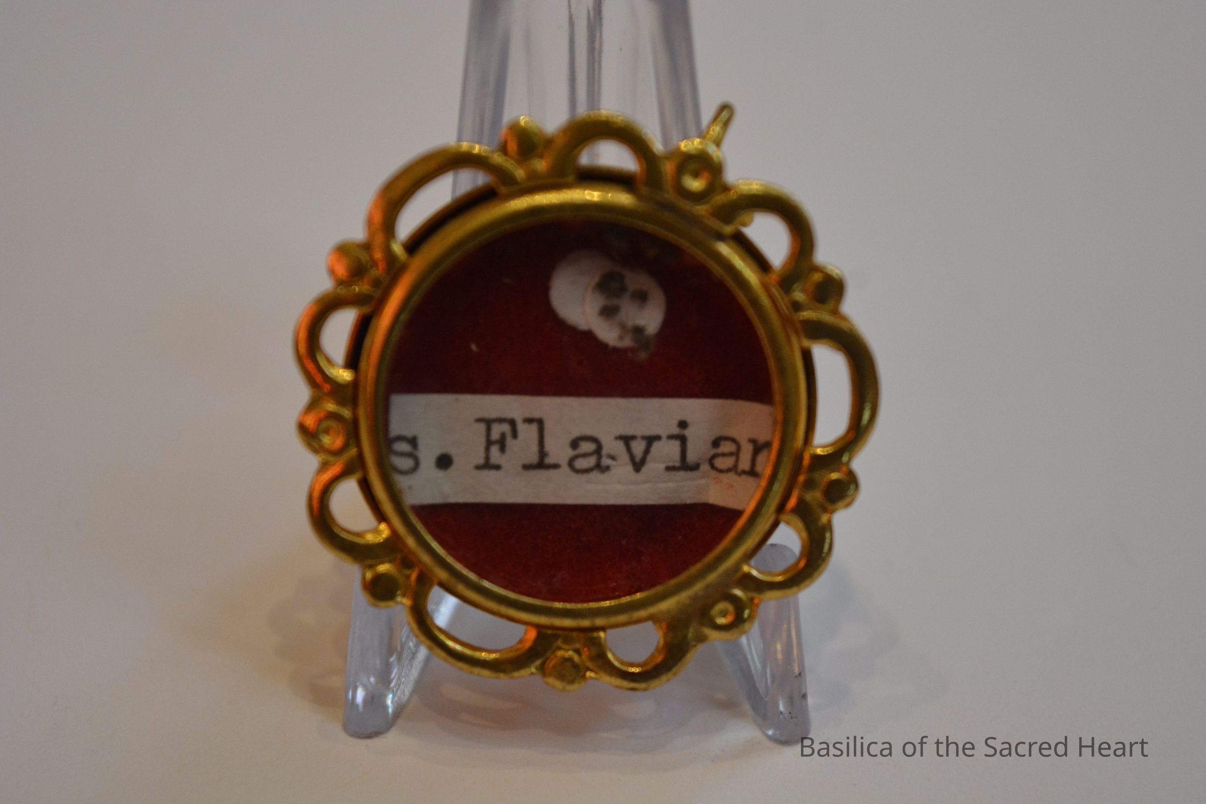 Relic of St. Flavian attached to two white cloth circles backed by red fabric. Paper label reads "s. Flavian". All contained in a round, brass theca.