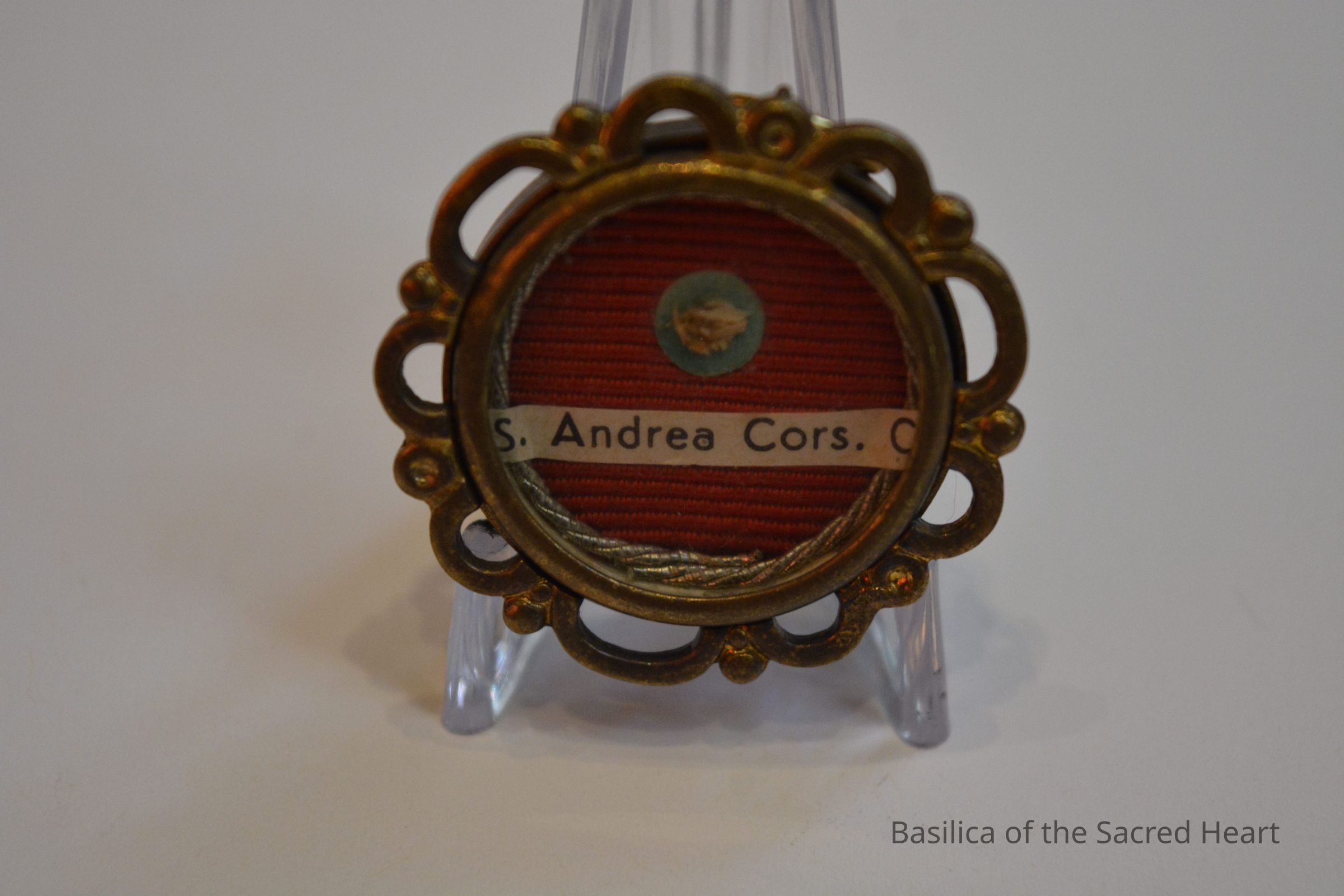 Bone of St. Andrew Corsini, bishop and confessor, attached to a small, blue, paper circle on a red fabric backing, surrounded by a gold cord. Paper label reads, "S. Andrea Cors. C". All is contained in a round, brass theca.Context