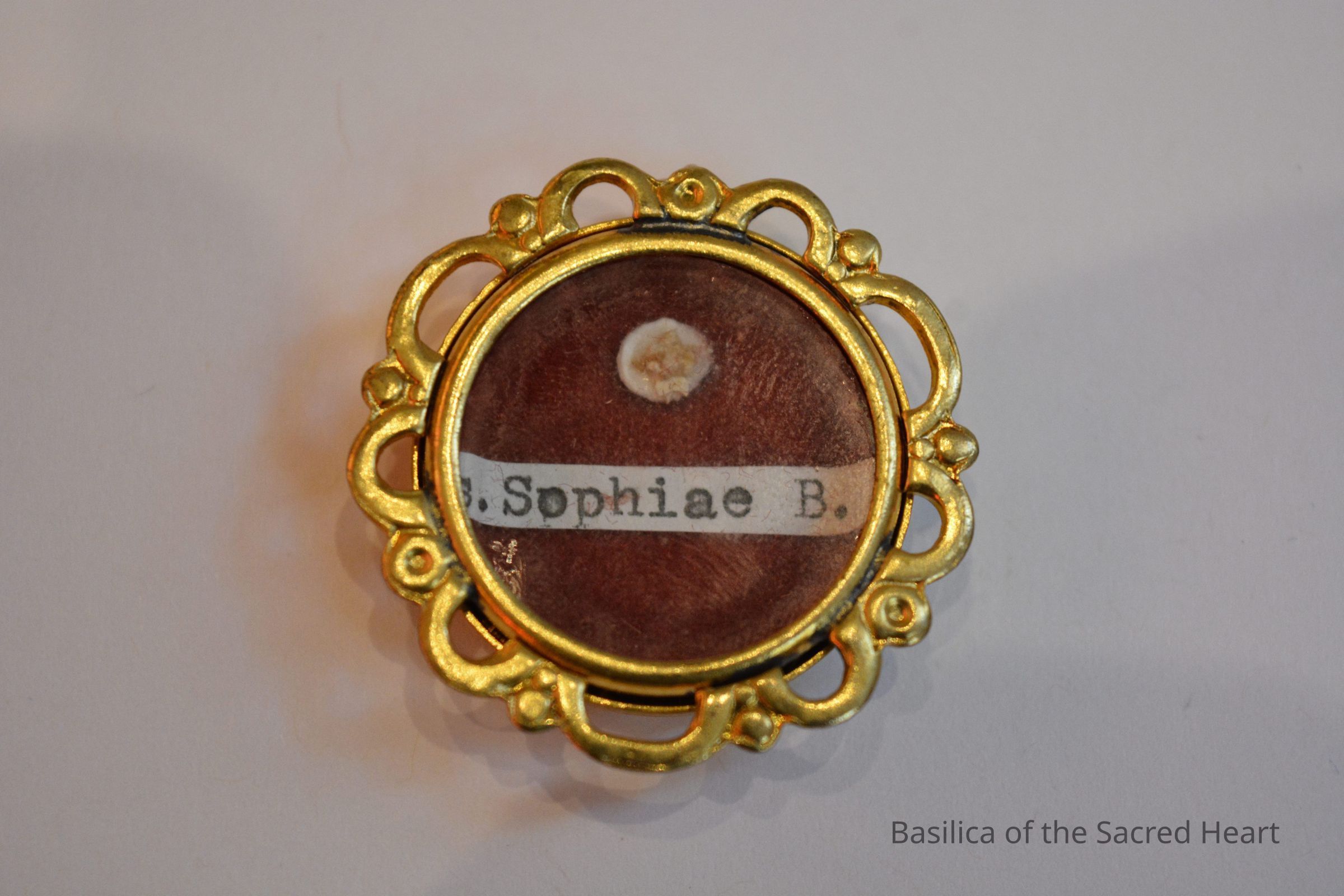 Bone relic of St. Sophia Barat, virgin, attached to white paper on a red velvet backing. Paper label reads "s. Sophiae B." All contained in a brass theca.