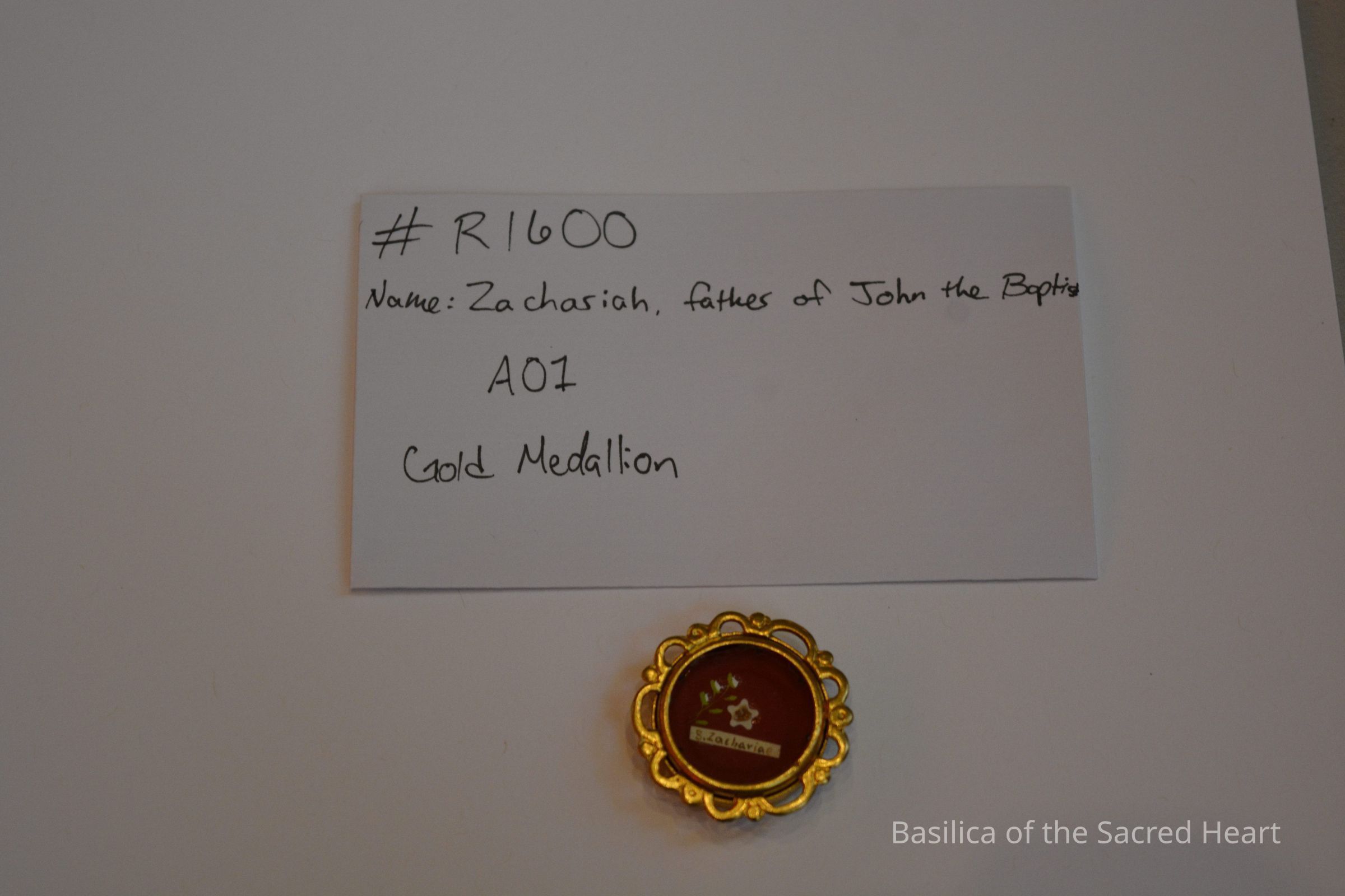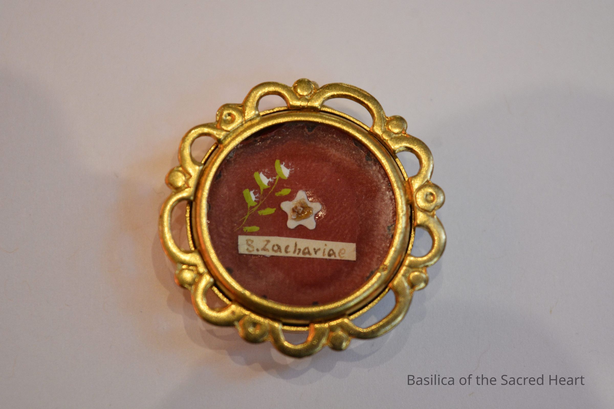 Relic of St. Zachariah, father of John the Baptist in round, brass theca. The relic is a piece of bone attached to a white paper flower. Backed by red velvet and decorated with a branch of green and white leaves. Paper tag underneath reads "S. Zachariae'.