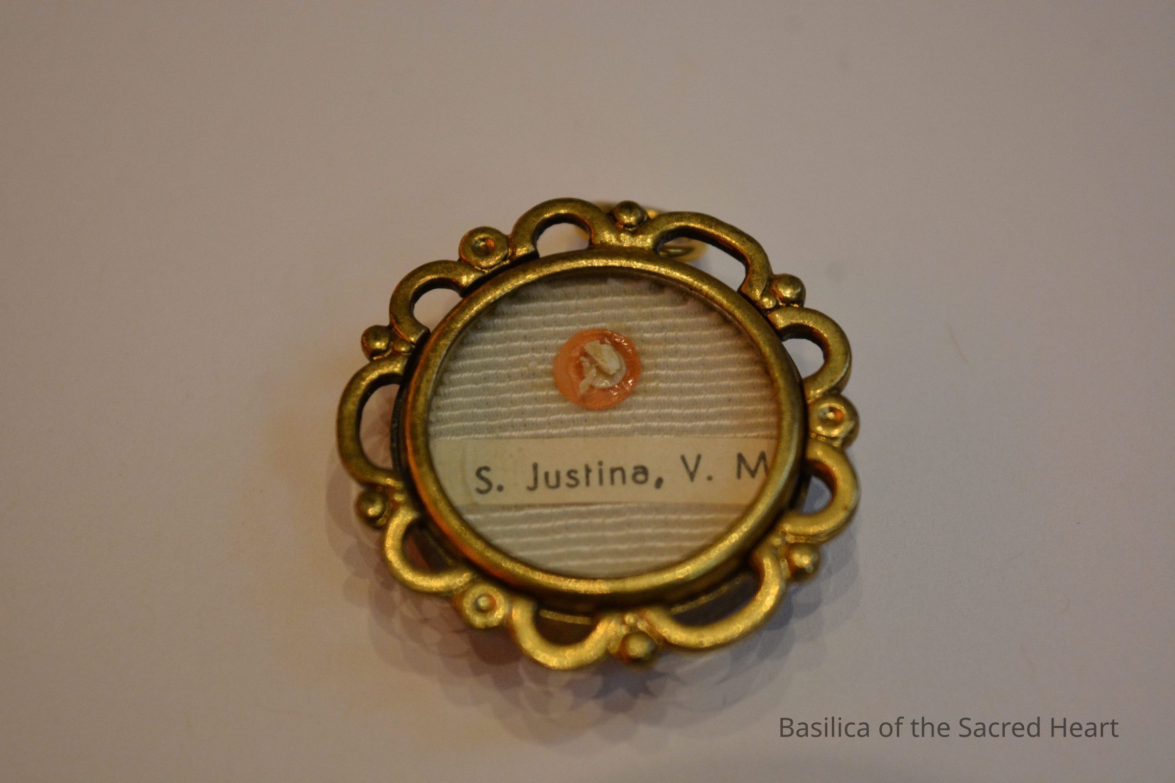 Bone relic of St. Justina, virgin and martyr, attached to pink paper on a white fabric backing. Paper label reads "S. Justina, V. M" All contained in a round, brass theca.