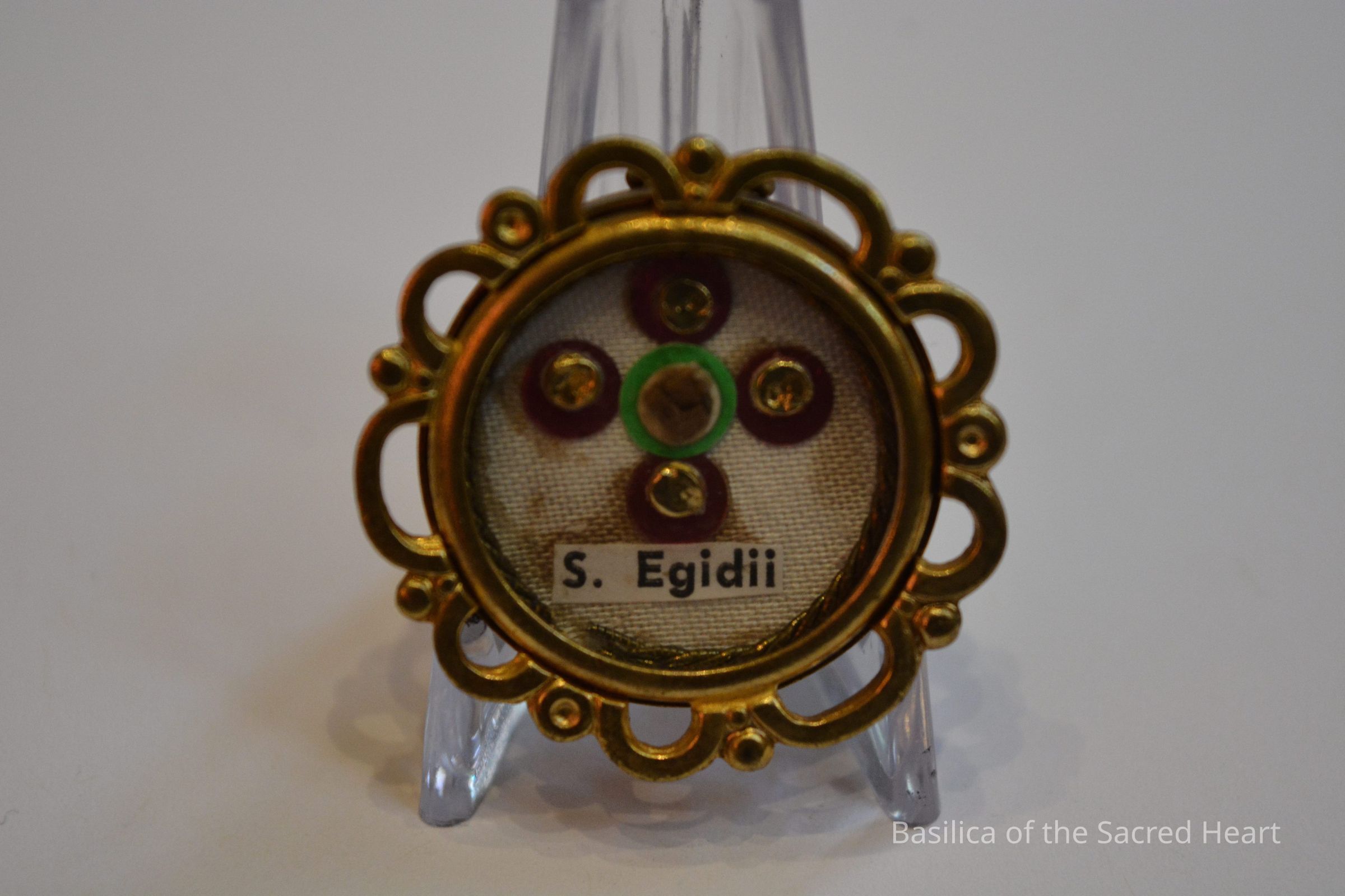 Bone relic of St. Egidius attached to a green circle of paper backed by white fabric. The fabric is decorated with shiny silver dots on top of red paper circles. The paper label reads "S. Egidii". All in contained in a round, brass theca.