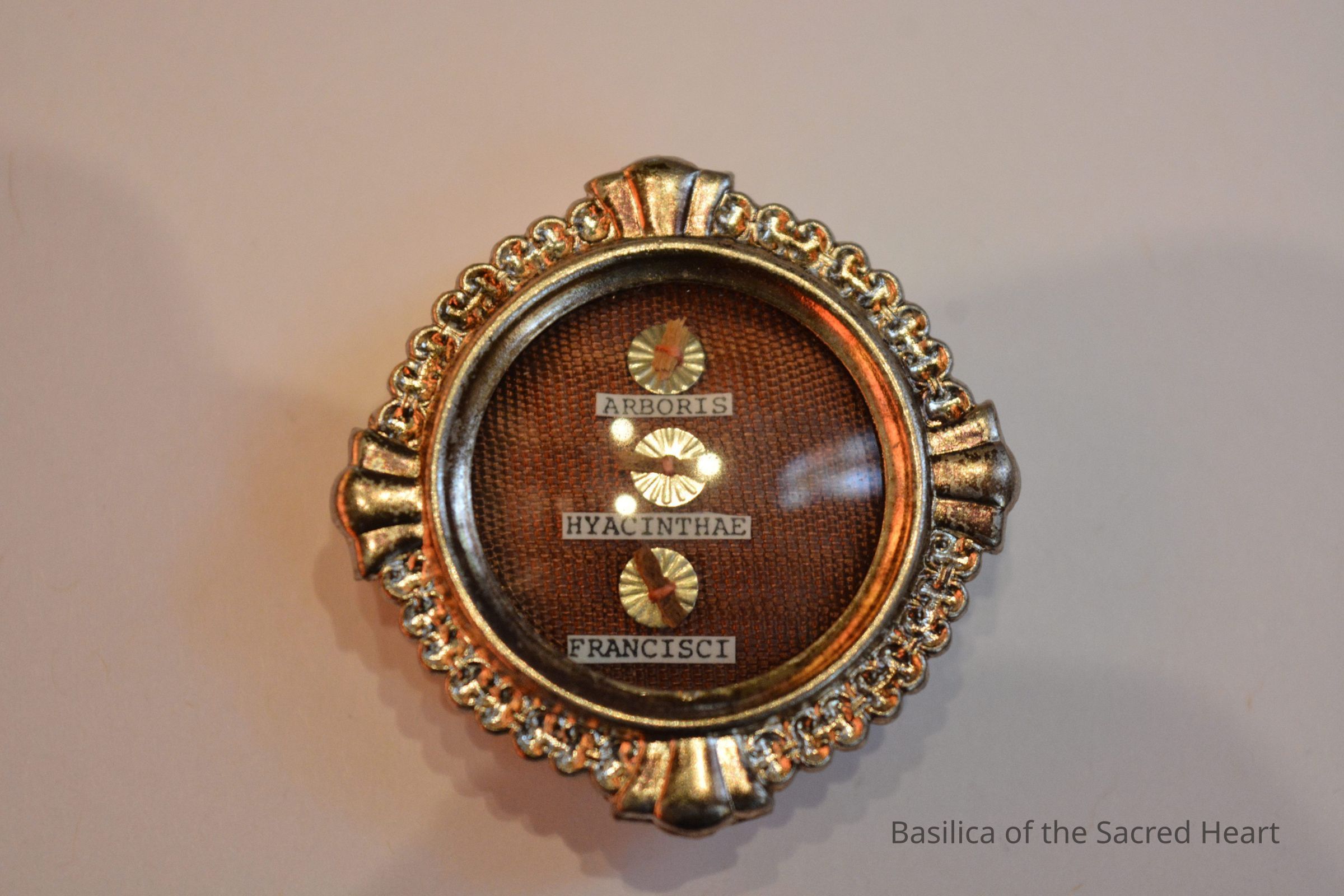 Relic of St. Jacinta Marto located in center of silver theca. Relic attached to a circle of gold paper, backed by red fabric. Combined in same theca as St. Francisco Marto and the tree on which Our Lady of Fatima appeared. Paper label reads "Hyacinthae".