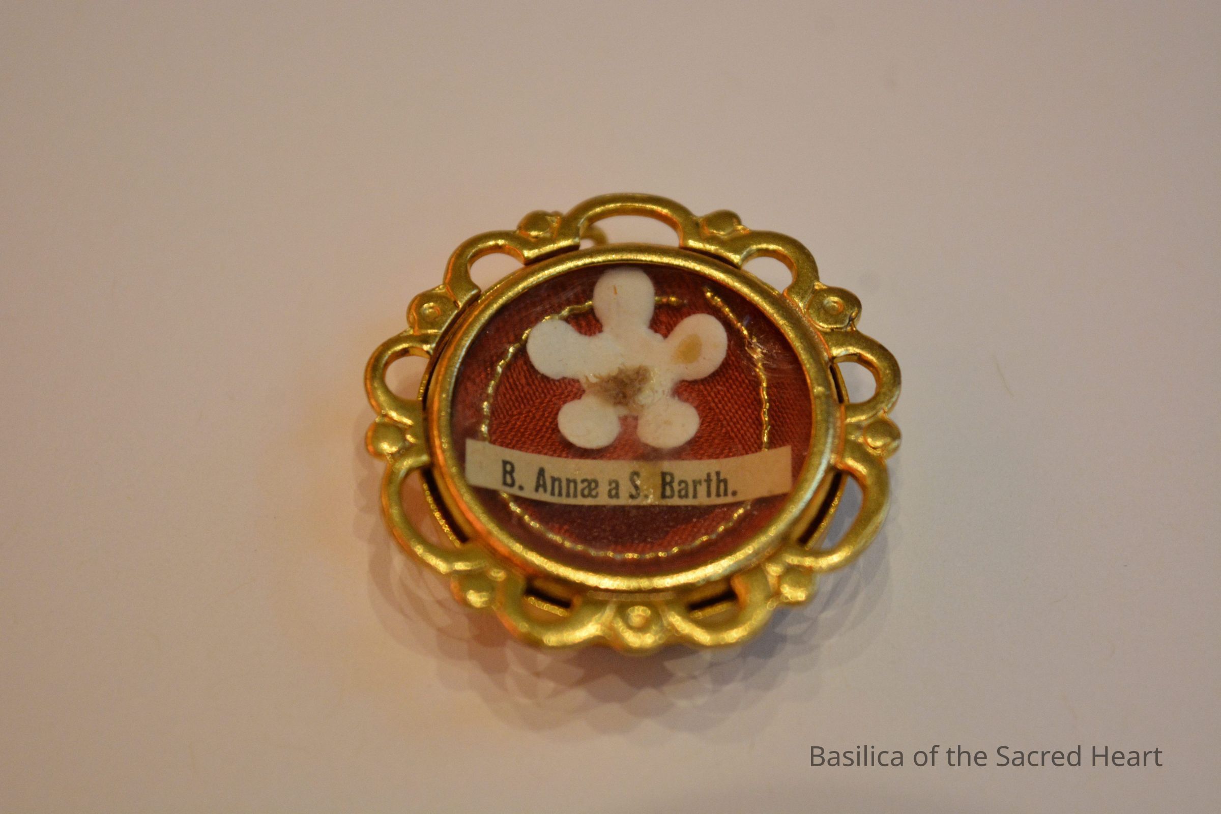 Bone relic of Blessed Anne of St. Bartholomew, virgin, attached to a white paper flower on a backing of red fabric, surrounded by gold thread. Paper label reads "B. Annae a S. Barth." All contained in round, brass theca.Context