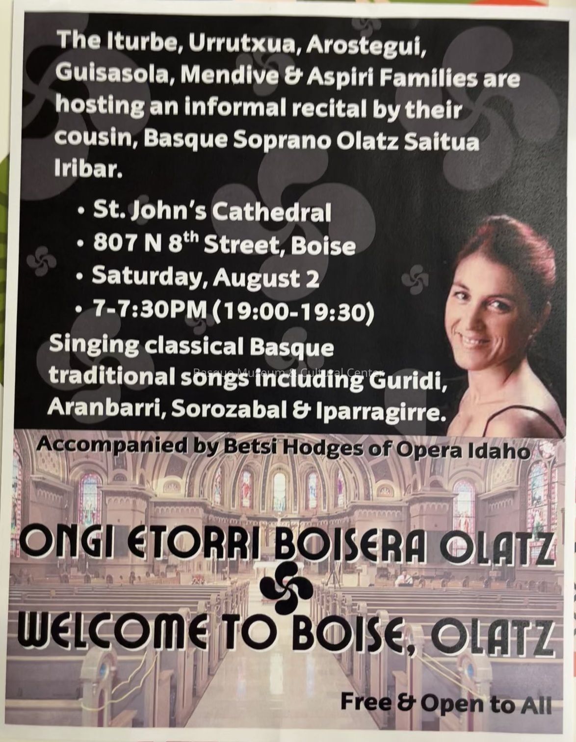 Color poster for a musical event sponsored by the Iturbe, Urrutxua, Arostegui, Guisasola, Mendive and Aspiri families, and featuring Basque soprano Olatz Saitua Iribar accompanied by Betsi Hodges of Opera Idaho.