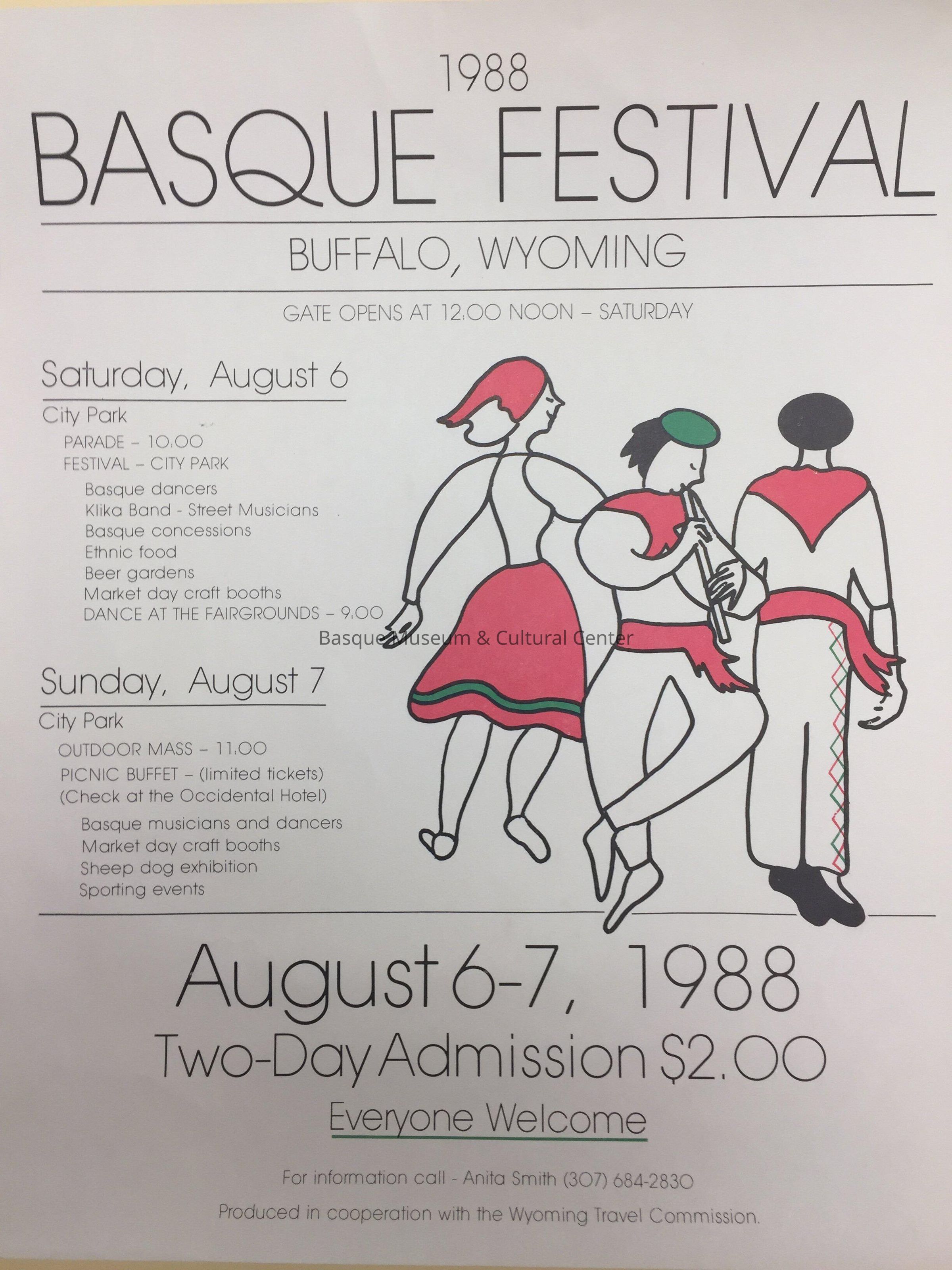 Poster for the 1988 Basque Festival held in Buffalo, Wyoming. Black lettering on white paper with three figures in red, green and black costume. Includes dates, admission and contact information, and agenda.