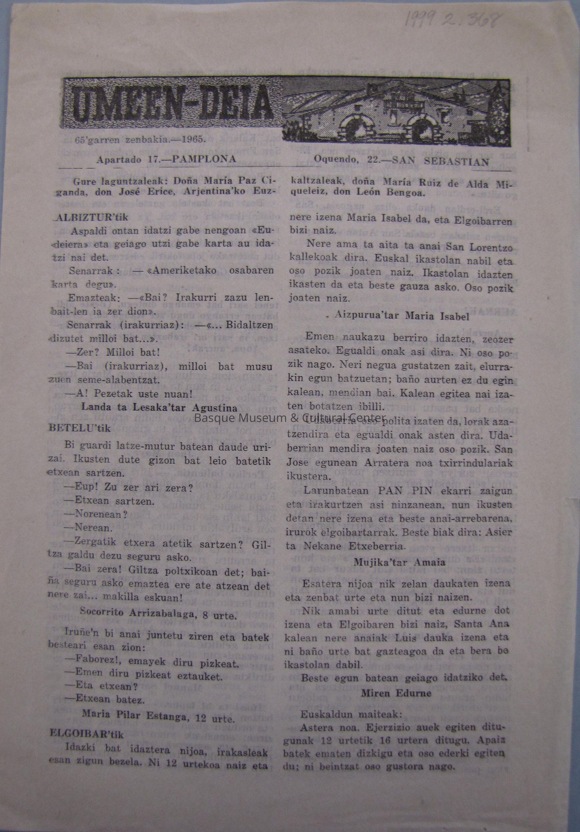One page, double sided; from the Basque National Front (Frente Nacional Vasco; Euzko Aberri Alkartasuna), an extraterritorial delegation from Venezuela; gives a history of the Spaniards' take over of the Basque Country, comparing it to Hitler's annexation of Czechoslovakia, Poland, and Austria.