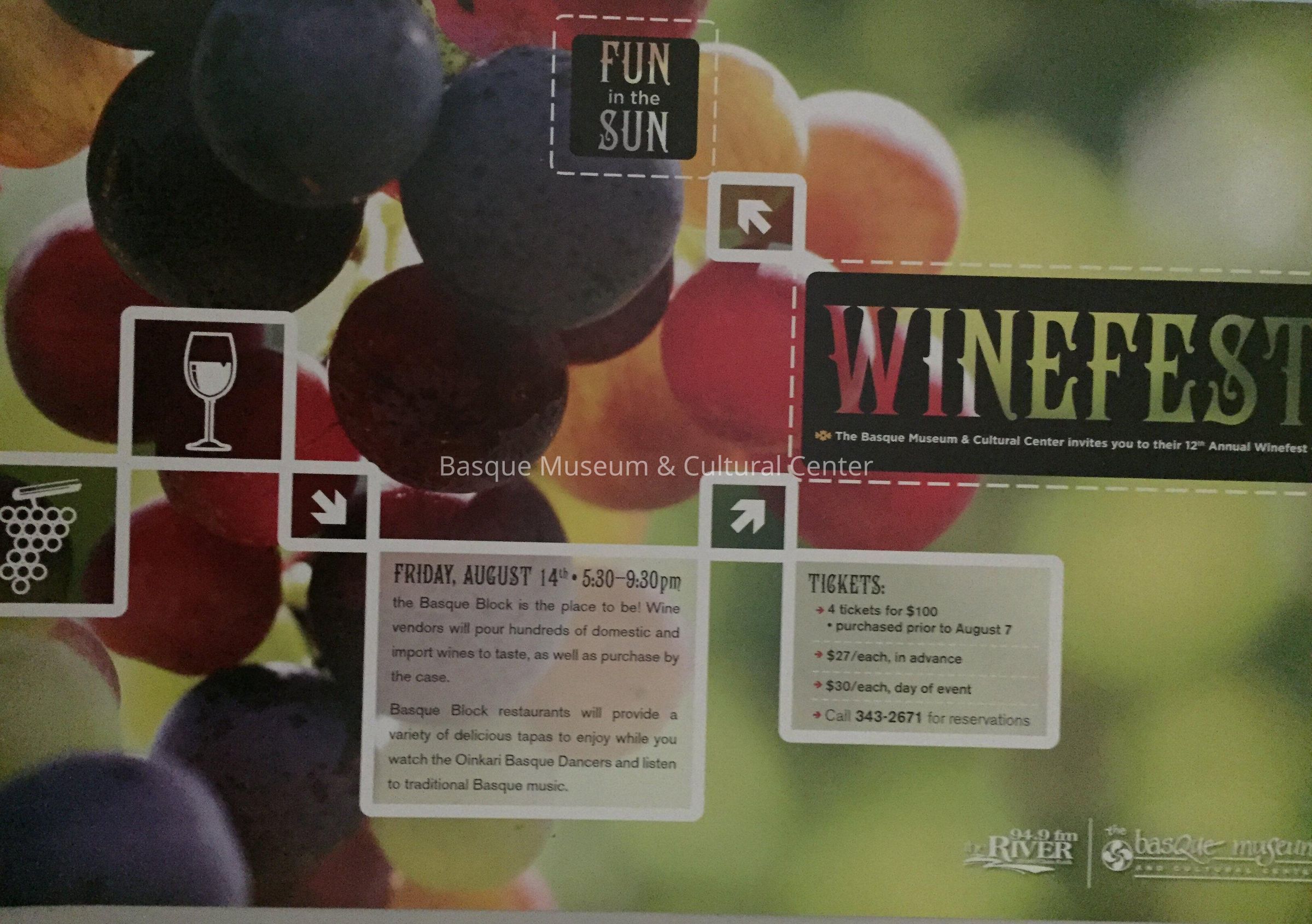 Poster for 12th annual WineFest, an annual fundraiser for the Basque Museum & Cultural Center. Features a bunch of ripened grapes behind text. Includes price and ticket information, sponsors and activities.