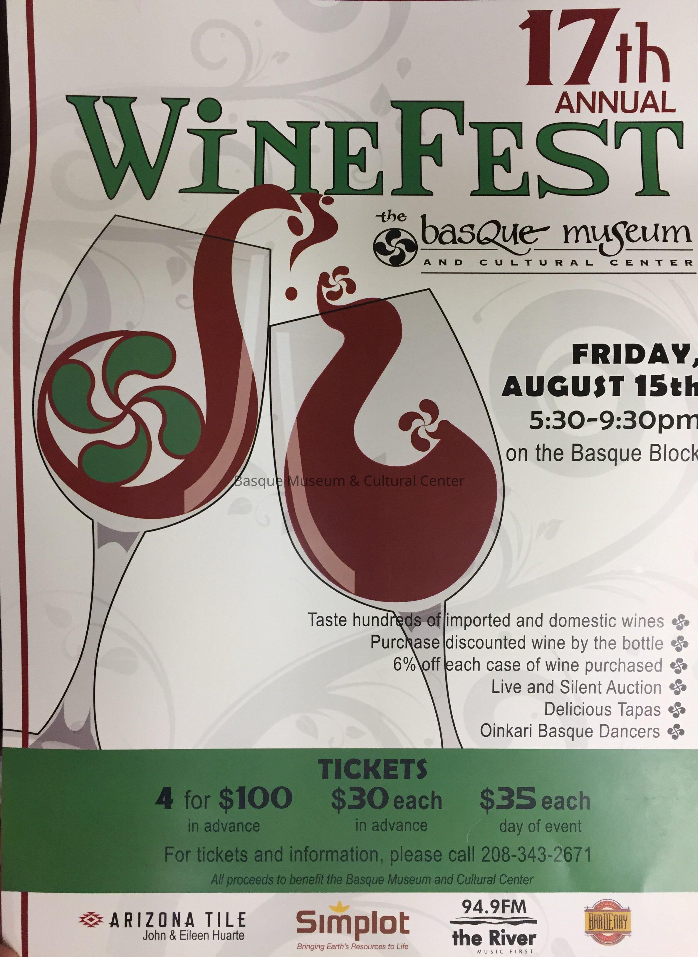 Poster for 17th annual WineFest, an annual fundraiser for the Basque Museum & Cultural Center. White background with red, green, black, and white lettering. Primary design elements are two glasses of wine, each featuring a lauburu. Includes price and ticket information, list of sponsors and activities.