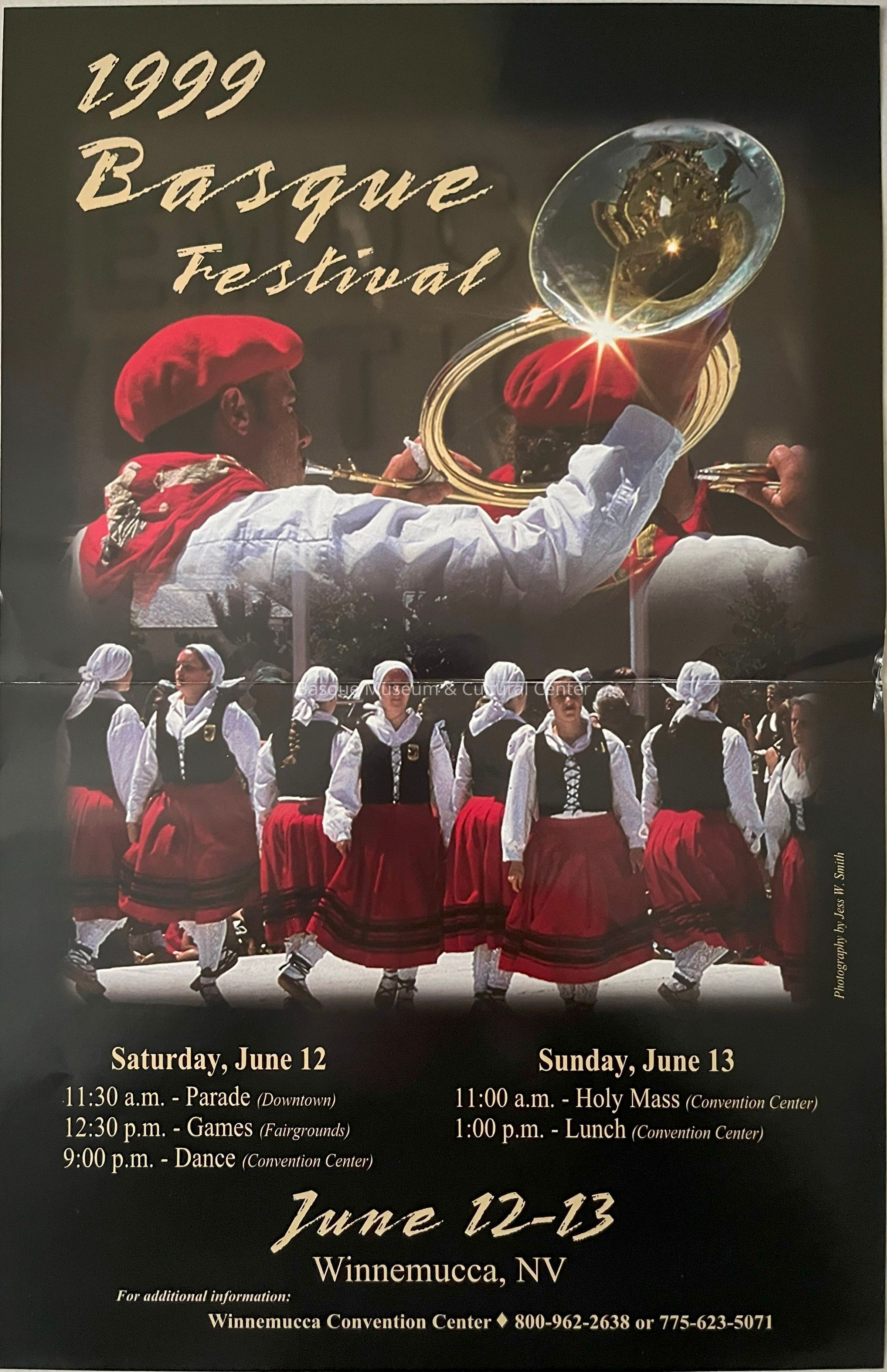 Full-color poster for the 1999 Basque Festival held in Winnemucca, Nevada on June 12 & 13. Includes photos of dancers and musicians in the background, plus schedule of events and contact for additional information.