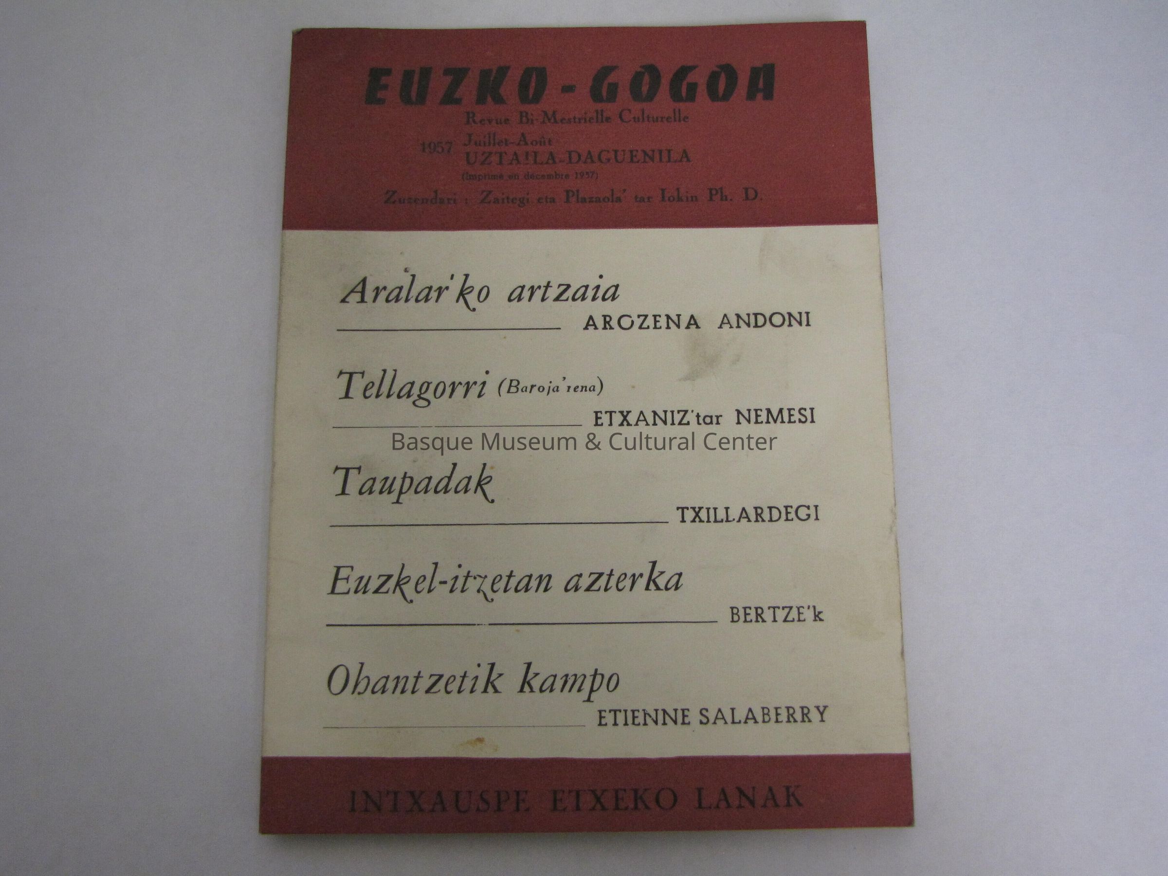 Euzko-Gogoa Revue Bi-Mestrielle Culturelle Juillet-Aout 1957 Uztaila-Daguenila Intxauspe Exteko Lanak v. ; 17 cm.