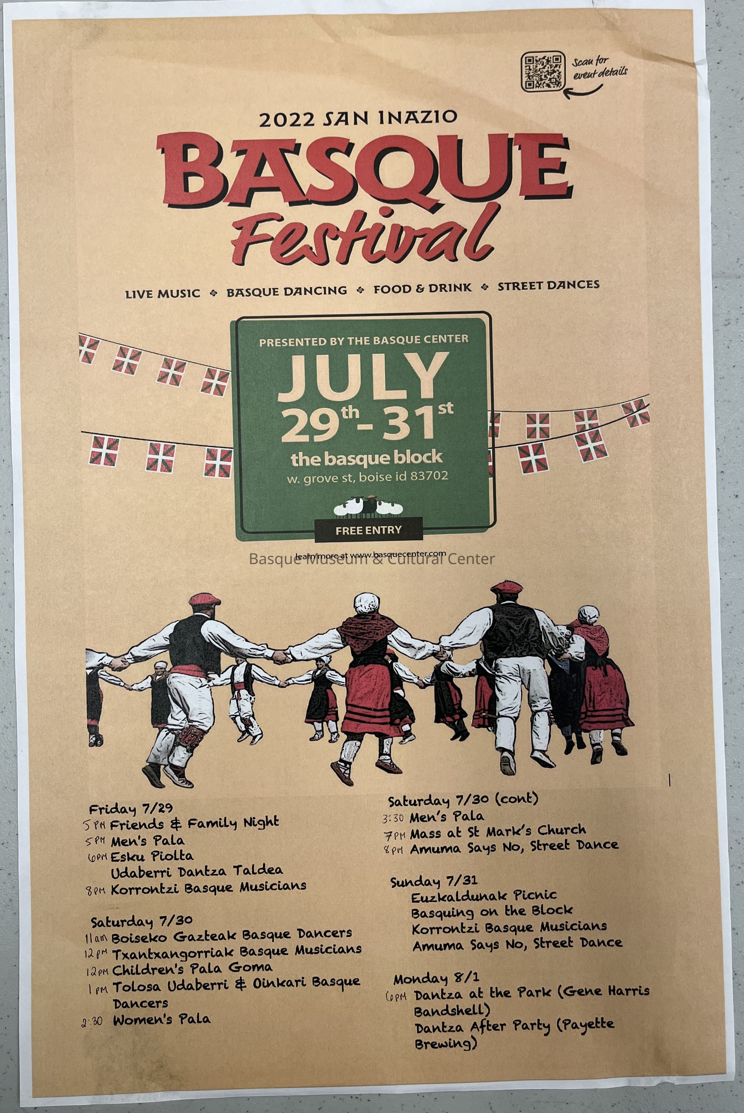 Full-color poster promoting the 2022 San Inazio Basque Festival held on the Basque Block in Boise, Idaho. Includes a representation of the Oinkari Basque Dancers, contact information and detailed list of activities.