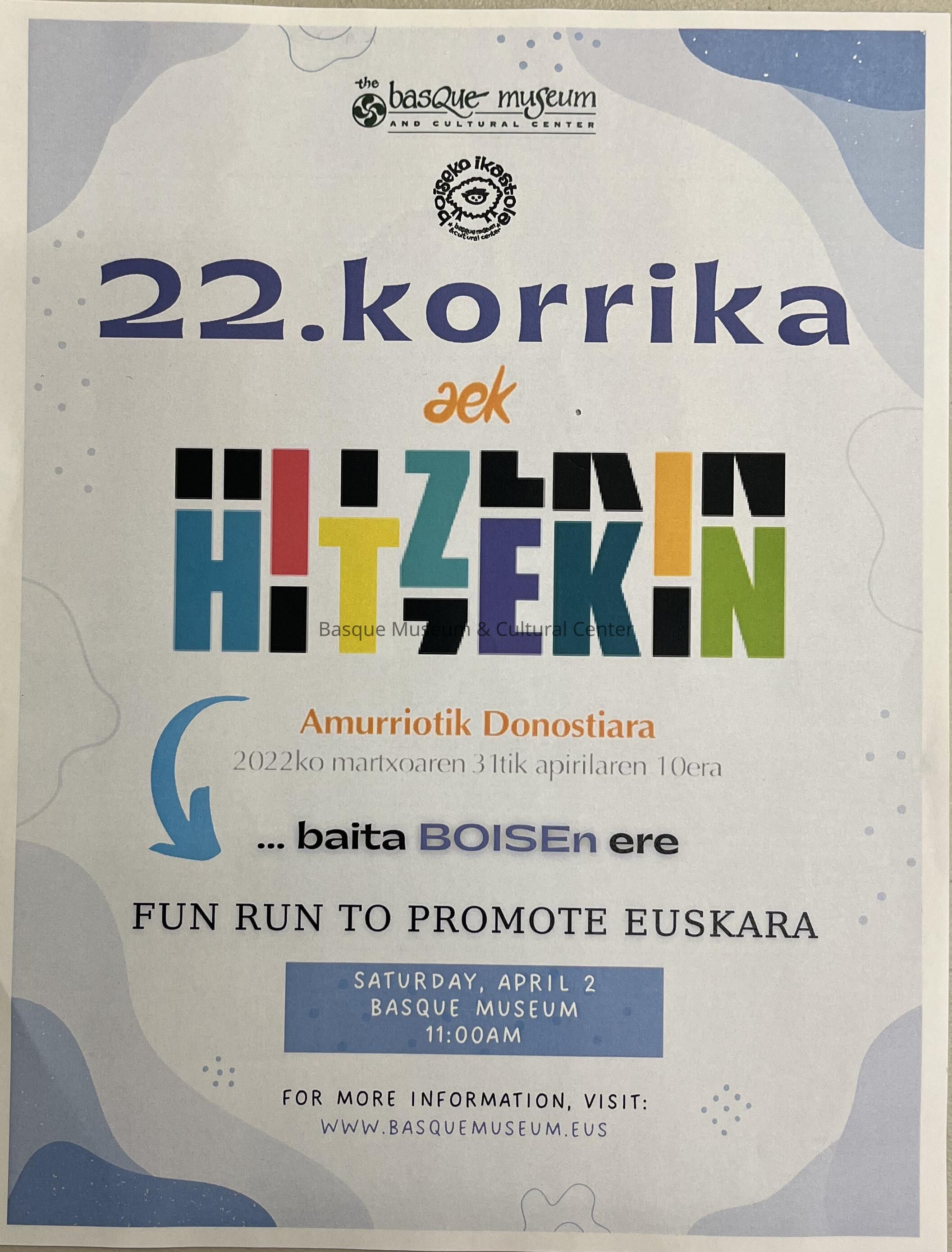 Full-color poster promoting the 2022 Korrika fun run, sponsored by the Basque Museum and Cultural Center in Boise to raise awareness and funds for the Basque language - Euskara. Includes the museum's logo, date and location of the run and website for additional information.