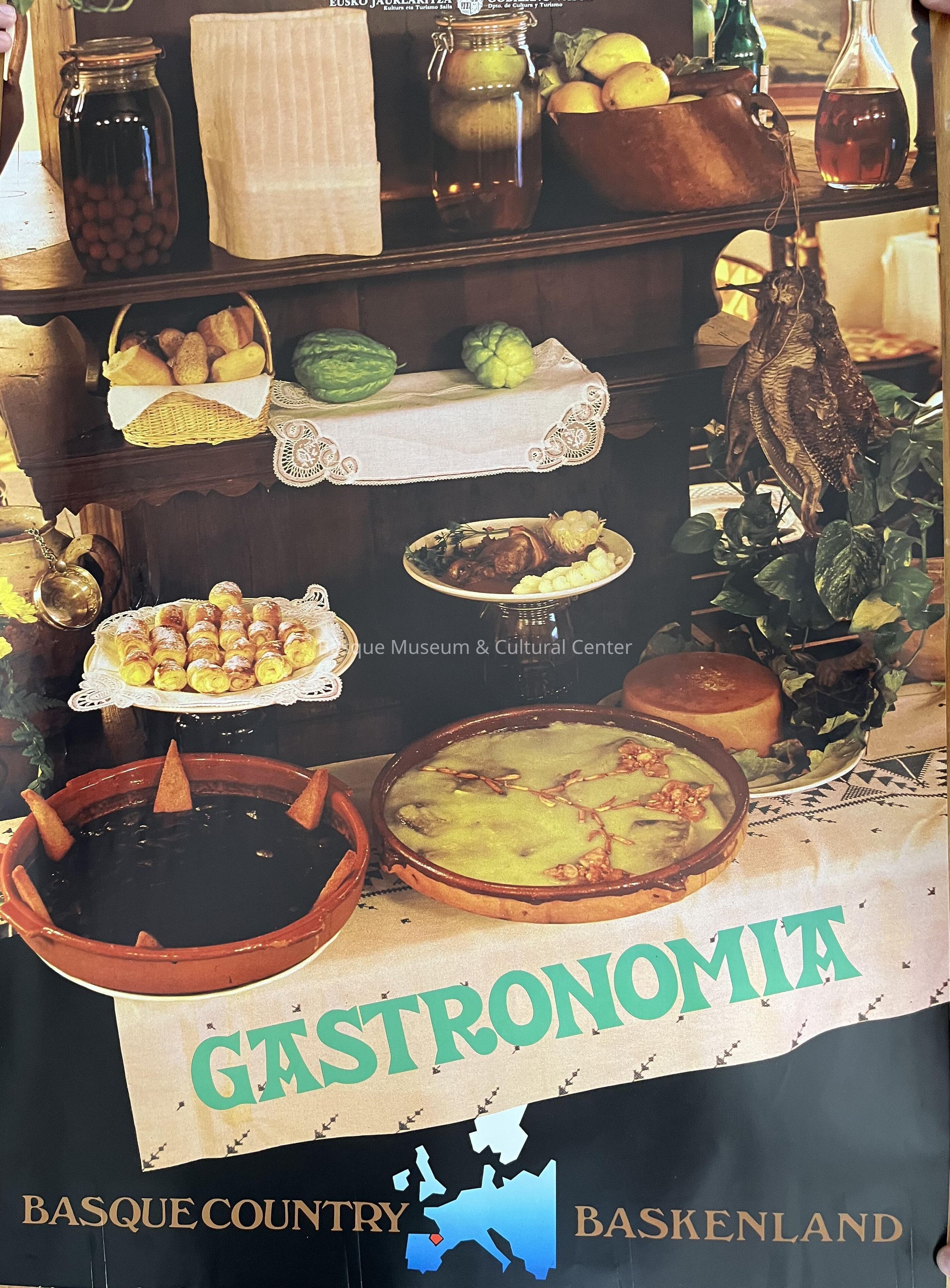 Full-Color Poster promoting tourism to the Basque Country by highlighting the foods that are famous from the area, including breads, pastries, and other dishes