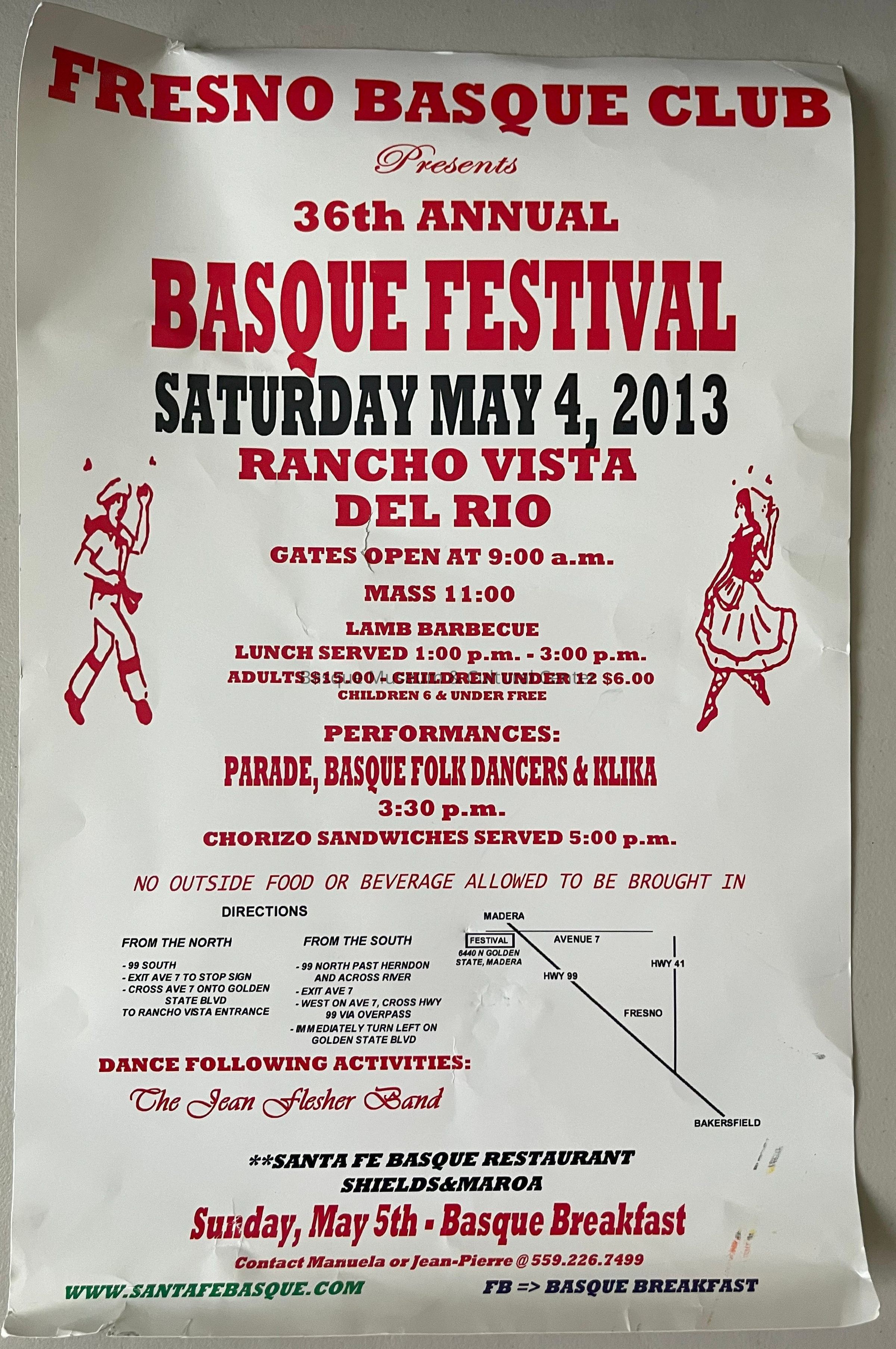 Promotional poster, red and black lettering on white posterboard, for the 36th annual Basque Festival held by the Fresno Basque Club. Includes dates and times; list of activities; prices; and directions.