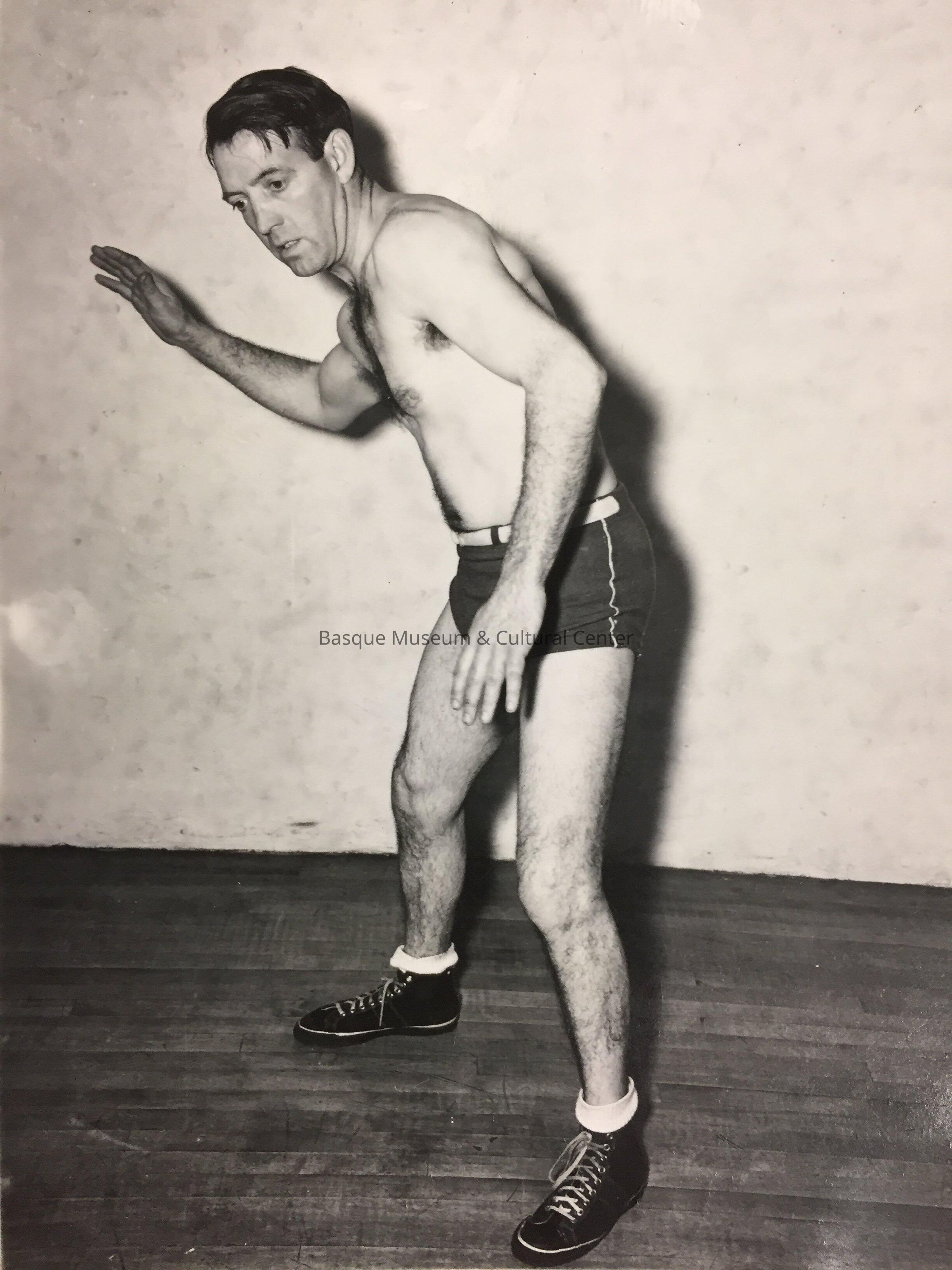 Black and white photoprint of Henry Alegria wearing [wrestling?] trunks and shoes, and standing in a [handball] stance.