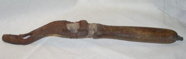 Stove lifter found in the parlor of 607 Grove Street during an archaeological excavation. The lifter looks very well used. The wooden handle fits into a curved metal piece which actually lifts the lid off of a coal or wood burning stove. Apparently the wood became dehydrated and the metal part fell off, because someone wrapped the end of the wooden handle with a piece of cotton cloth and fit it back inside the metal portion. There is also a small metal piece inserted into the back end of the handle. It may have acted as a hook for storage.