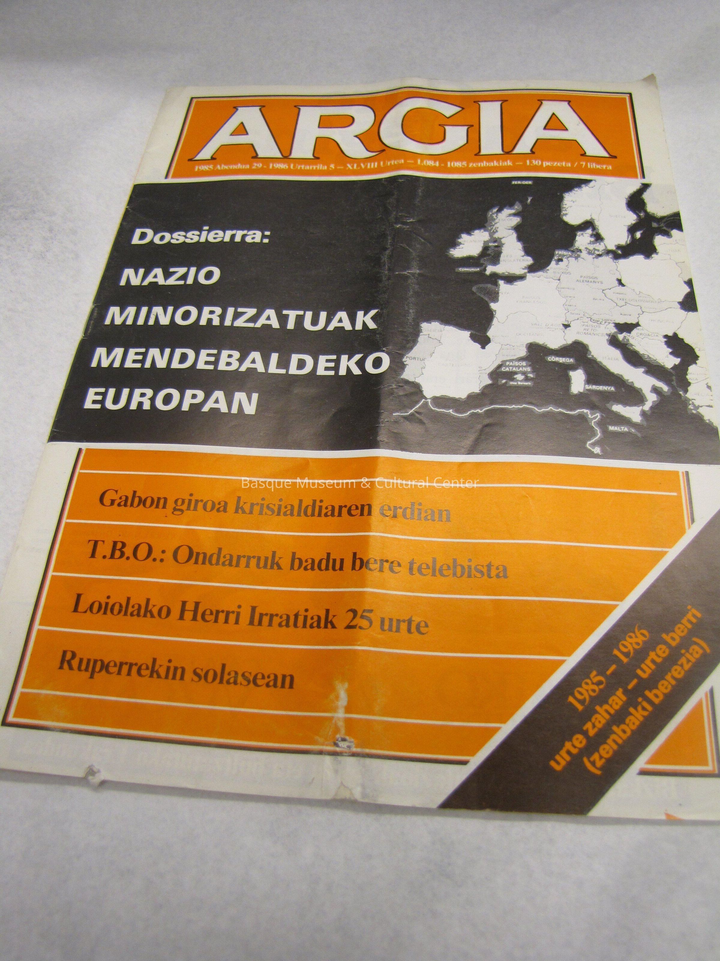 Argia 1985 Urtarrila 27 - XLVIII.urtea - 1.045 zenbakia.11 pezeta/6libera Headline says "Protekzio Zibileko Zerbitzua" Cover is dark yellow with a purle title.