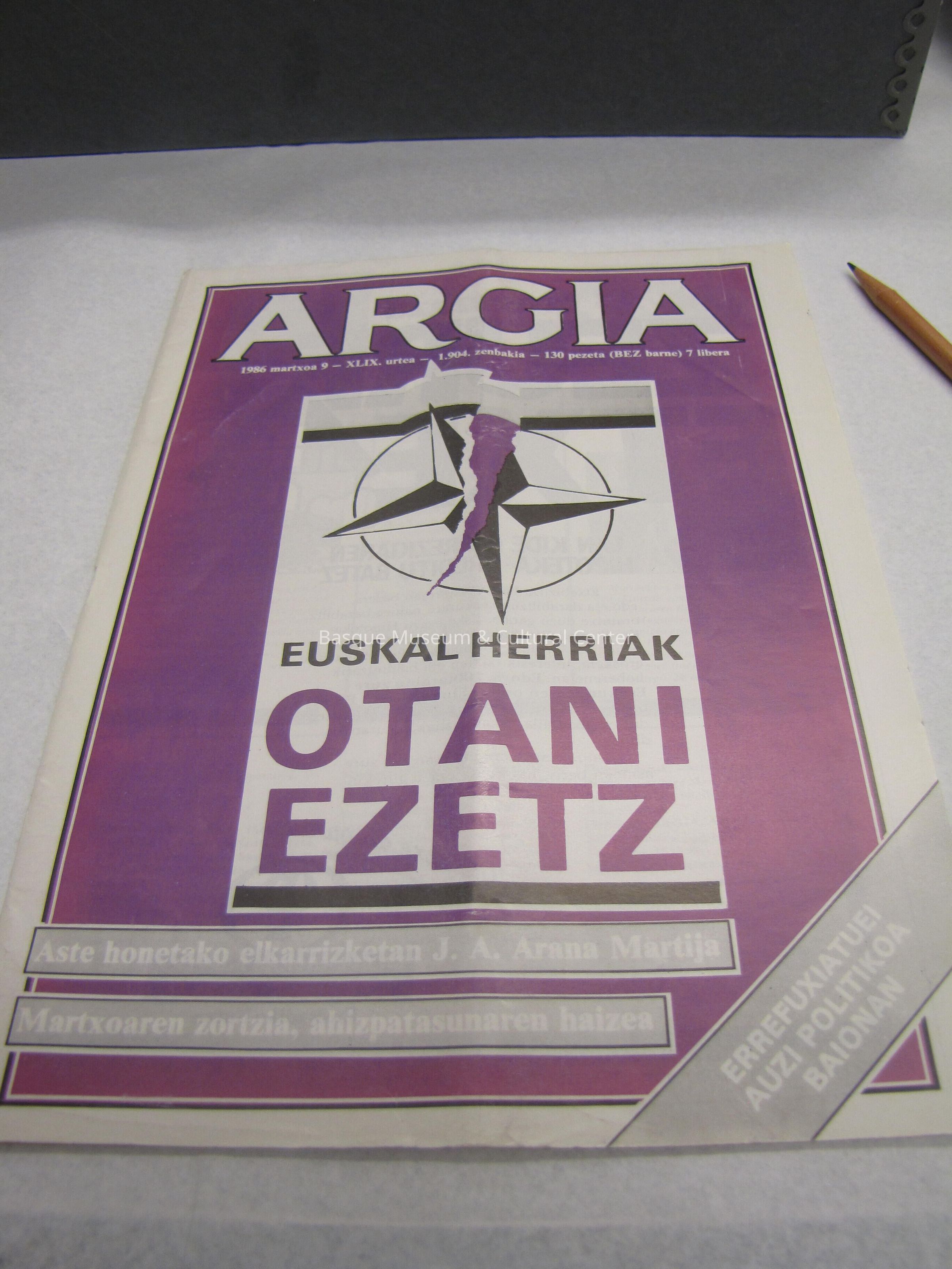 Argia 1986 Martxoa 9 XLIX. urtea- 1.904, Zenbakia- 130 pezeta(BEZ barne) /7 libera Headline says: "Euskal Herriak Otani Ezetz" Cover has a white border with a purple background and white title.