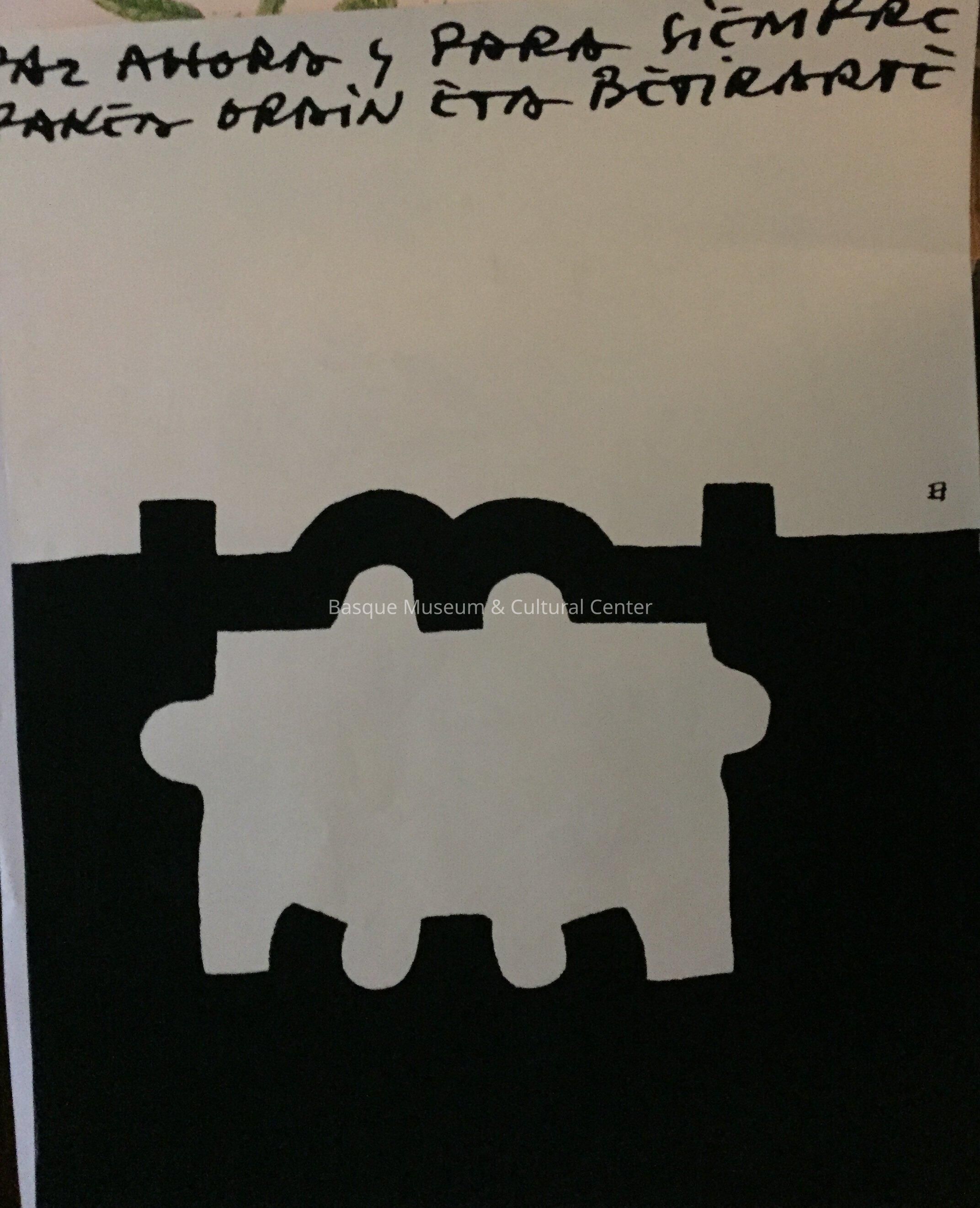 Black and white poster with black lettering on white ground on upper half and black symbol [of the Gernika Town Council?] on bottom. In Euskara and Spanish.