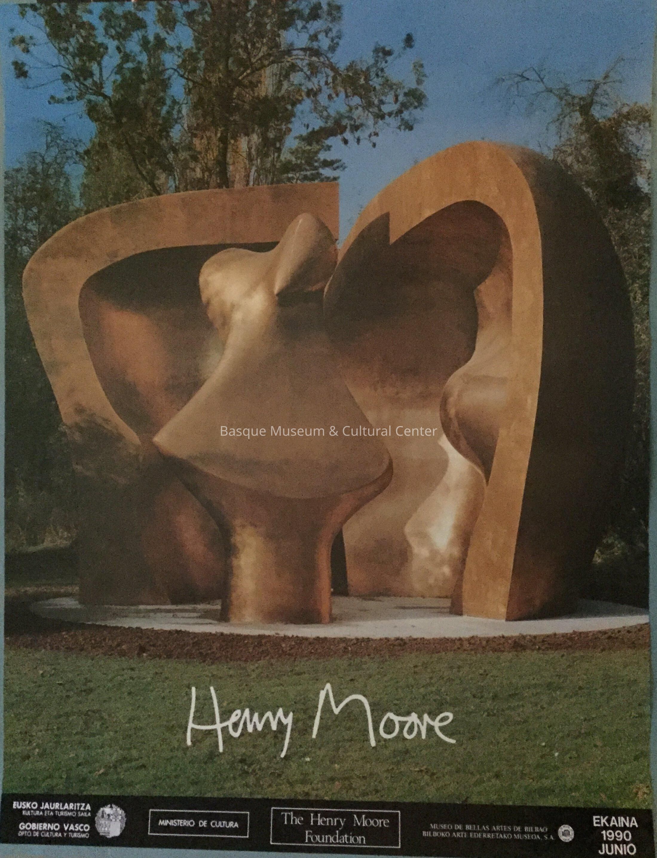 Full-color poster promoting an exhibit of sculpture by Henry Moore at the Museo Bellas Arts de Bilbao=Bilboko Arte Ederretako Museoa. Published by Eusko Jaurlaritza/Gobierno Vasco and sponsored by The Henry Moore Foundation.