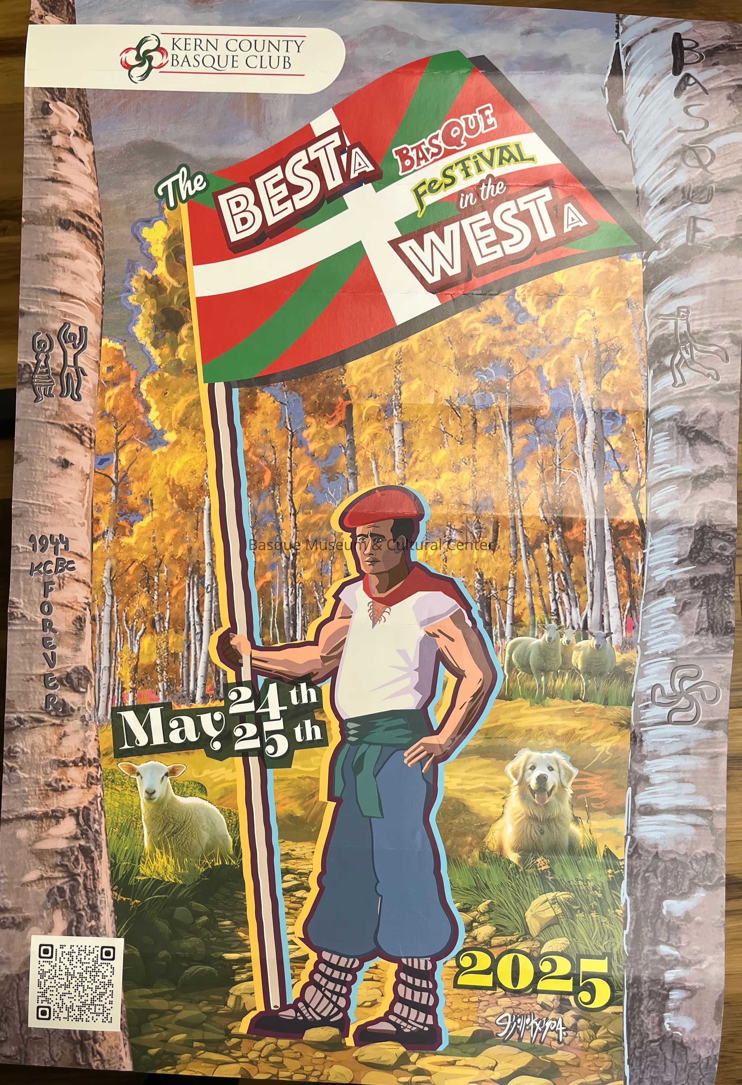 Full-color poster promoting "The Besta Basque Festival in the Westa," held by the Kern County Basque Club. Features a stylized man in traditional clothing, including a txapela; an ikurrina; trees, including two with arborglyphs; sheep; and a dog. There is also a QR code for additional information and the dates of May 24th and 25th.