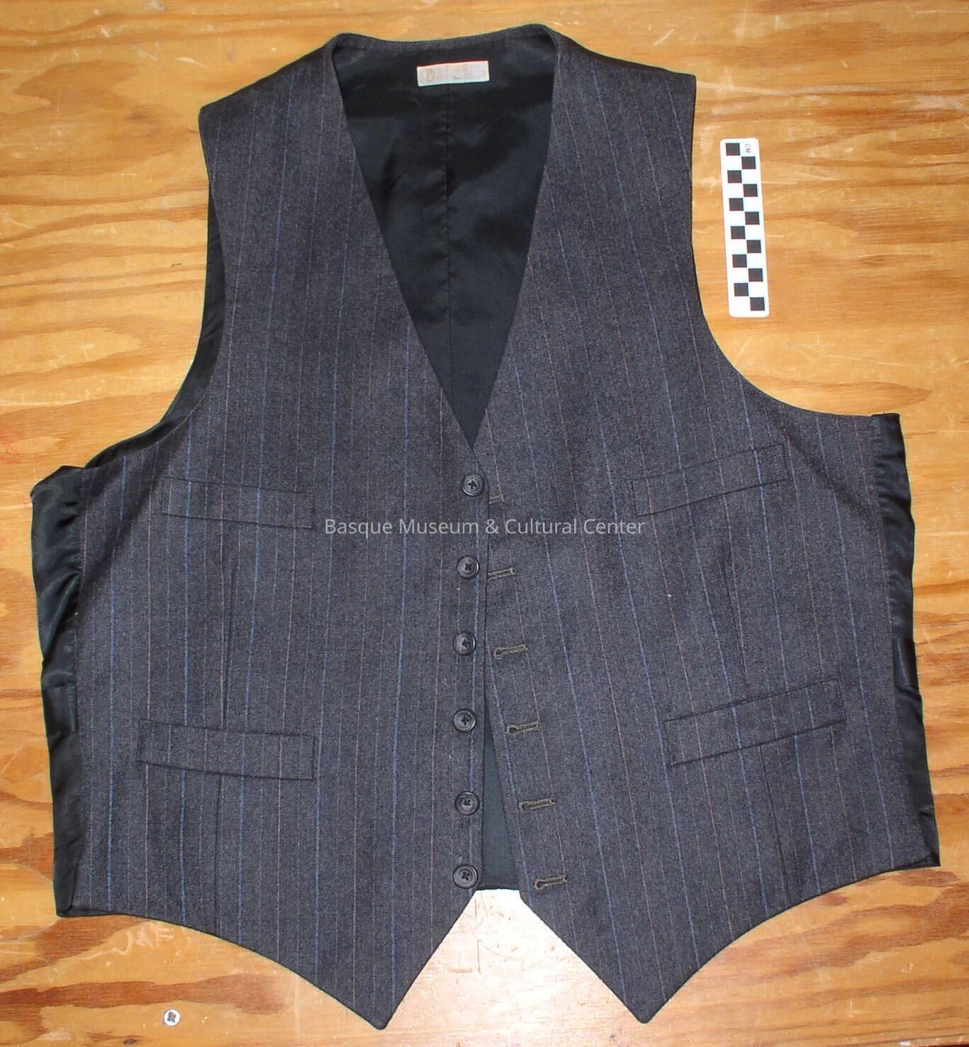 Men's charcoal gray wool vest with light gray, red, and blue vertical pin stripes. Silk lining and backing. Six charcoal gray buttons down the center and four pockets, two on each side, and cinch back with metal buckle.