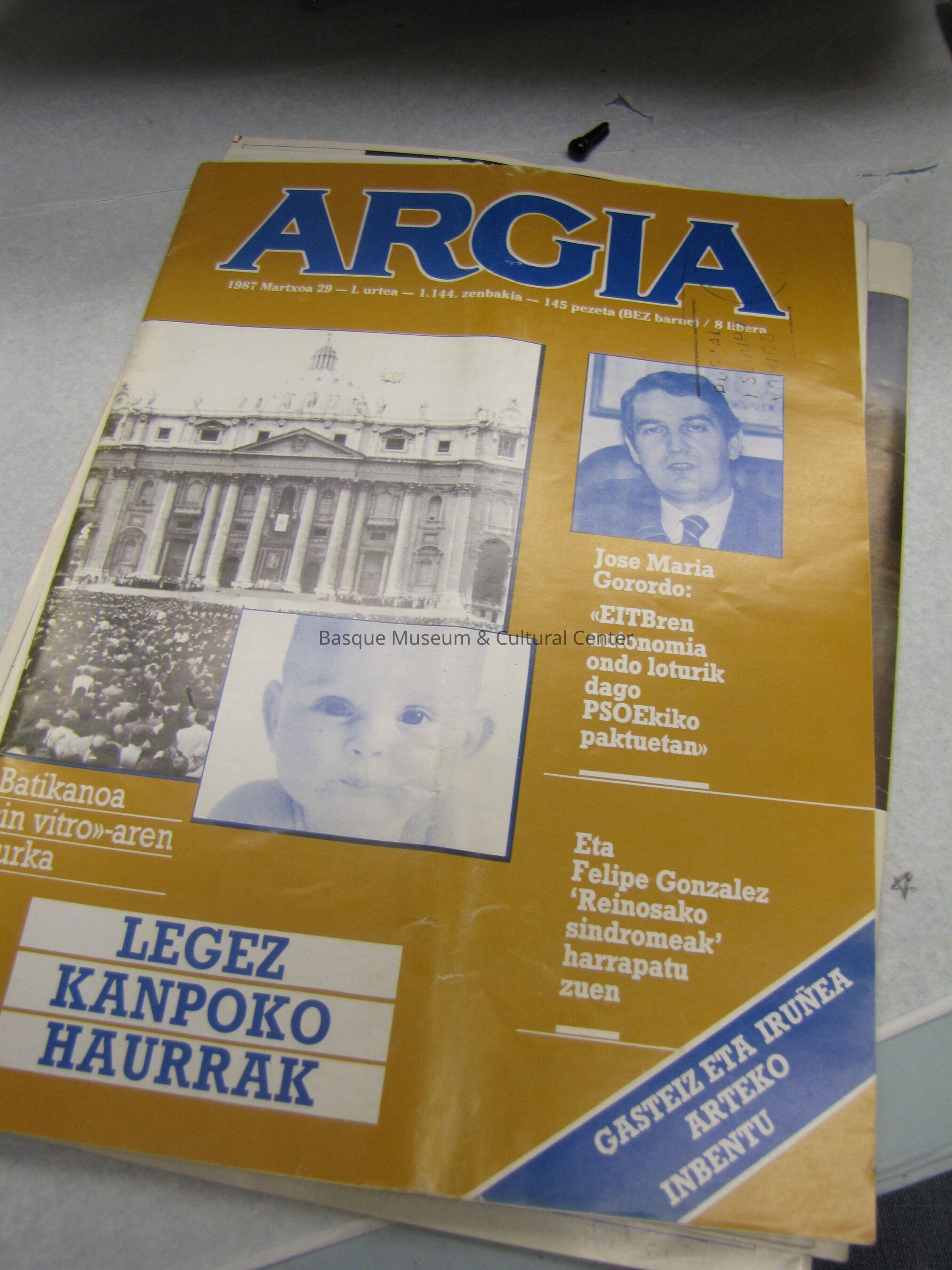 Argia 1987 Martxoa 29- L urtea- 1.144. Zenbakia- 145 pezeta(BEZ barne) /8 libera Headline says: " Legez Kanpoko Haurrak" Cover is all dark yellow with a blue title and black and white pictures.