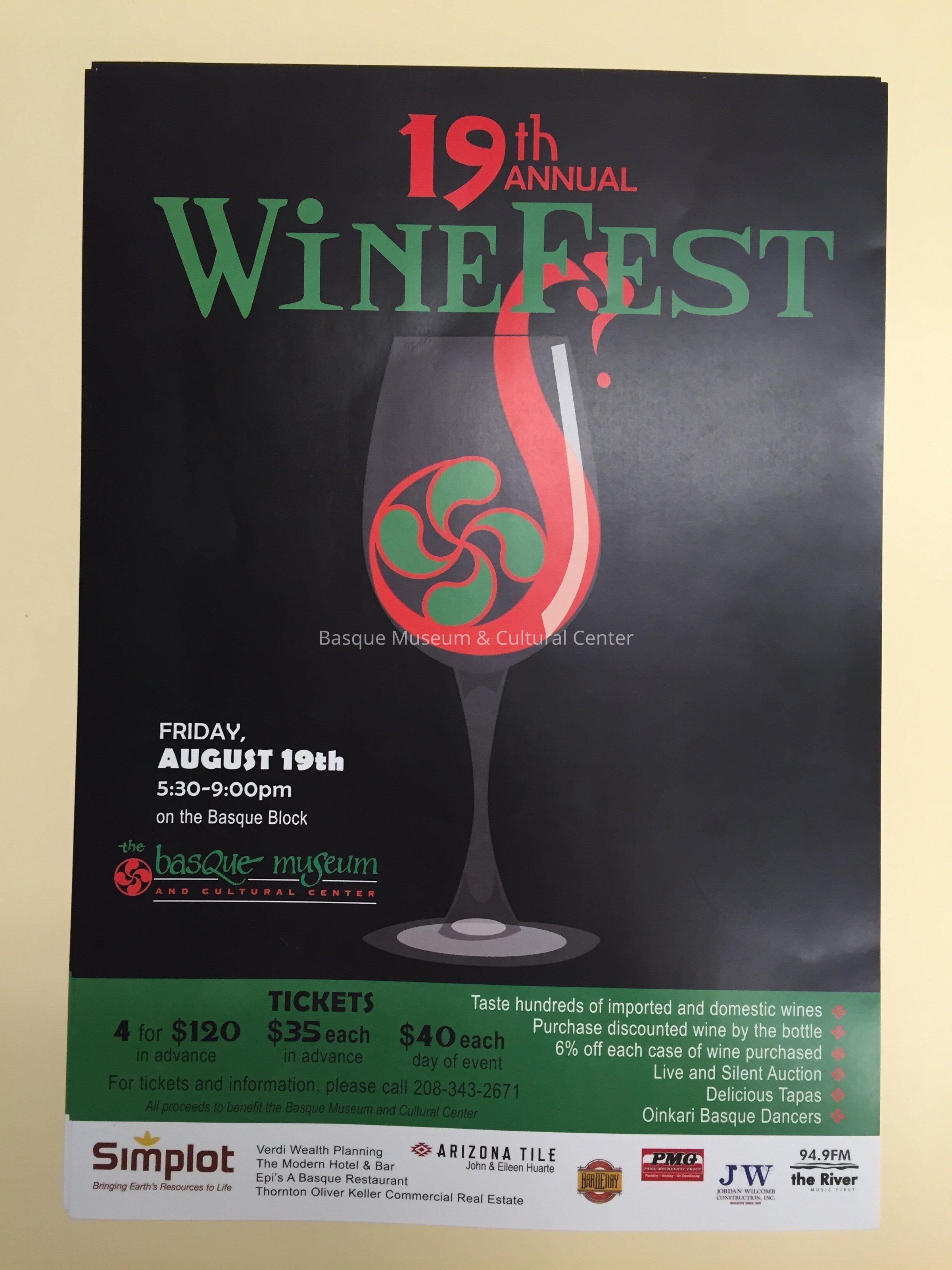 Poster for 19th annual WineFest, an annual fundraiser for the Basque Museum & Cultural Center. Black background with red, green, and white lettering. Includes list of activities, cost, contact information, and sponsors/