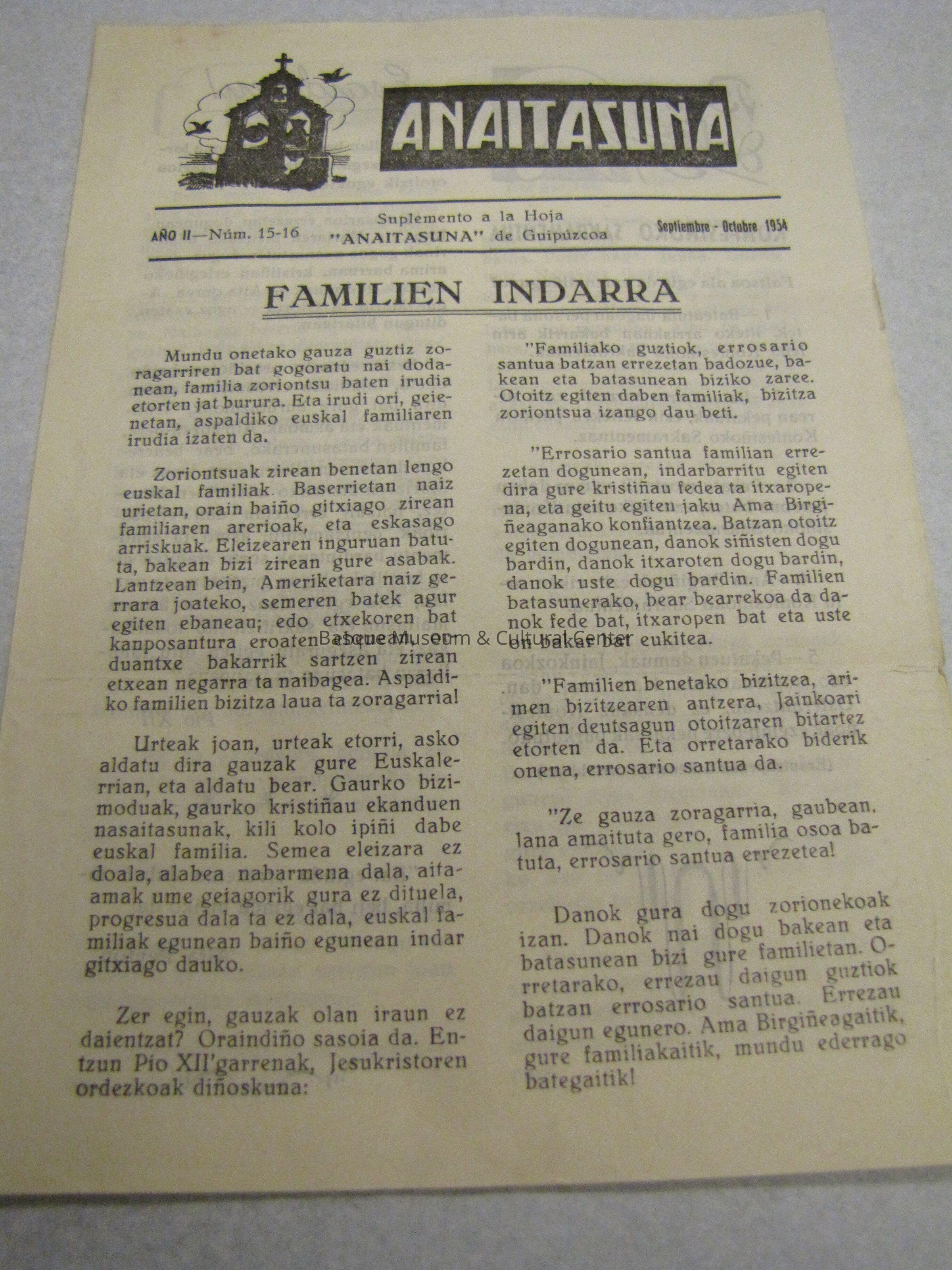 Very short four page periodical called "Anaitazuna" This one is Ano II Num. 15-16 Septiembre- Octobre 1954