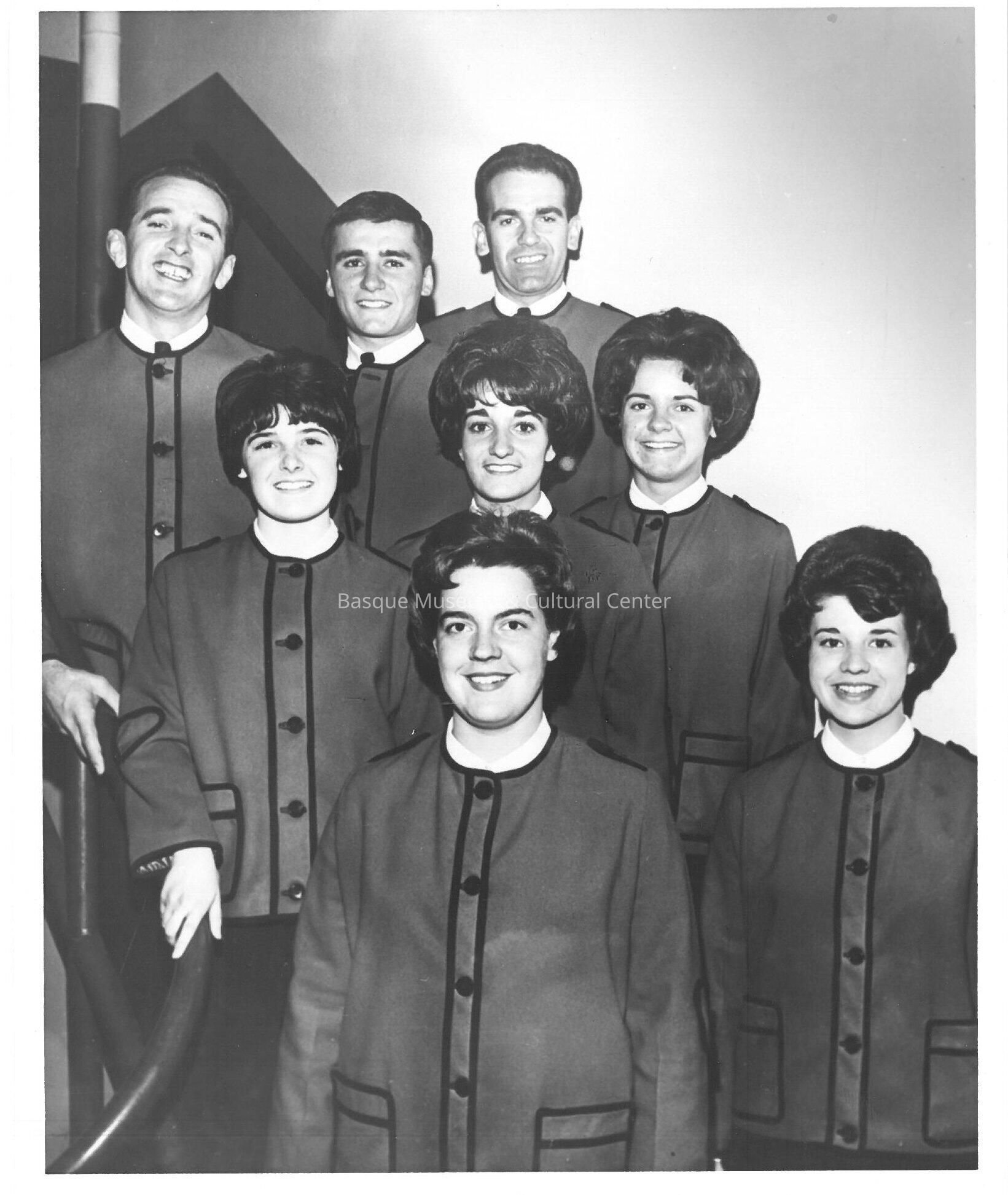 Copy of a black and white photo print - Portrait of the officers of the Oinkari Basque Dancers. There are 3 men, and 5 women wearing traveling costumes posing on a staircase. Eight people in total. L-R (back row): Simon Achabal, John Aldape, Al Erquiaga; (middle row): Juliana Jausoro, Toni Bicandi, Rosita Anchustegui; (front row): Toni Murelaga, Gloria Subisarreta
