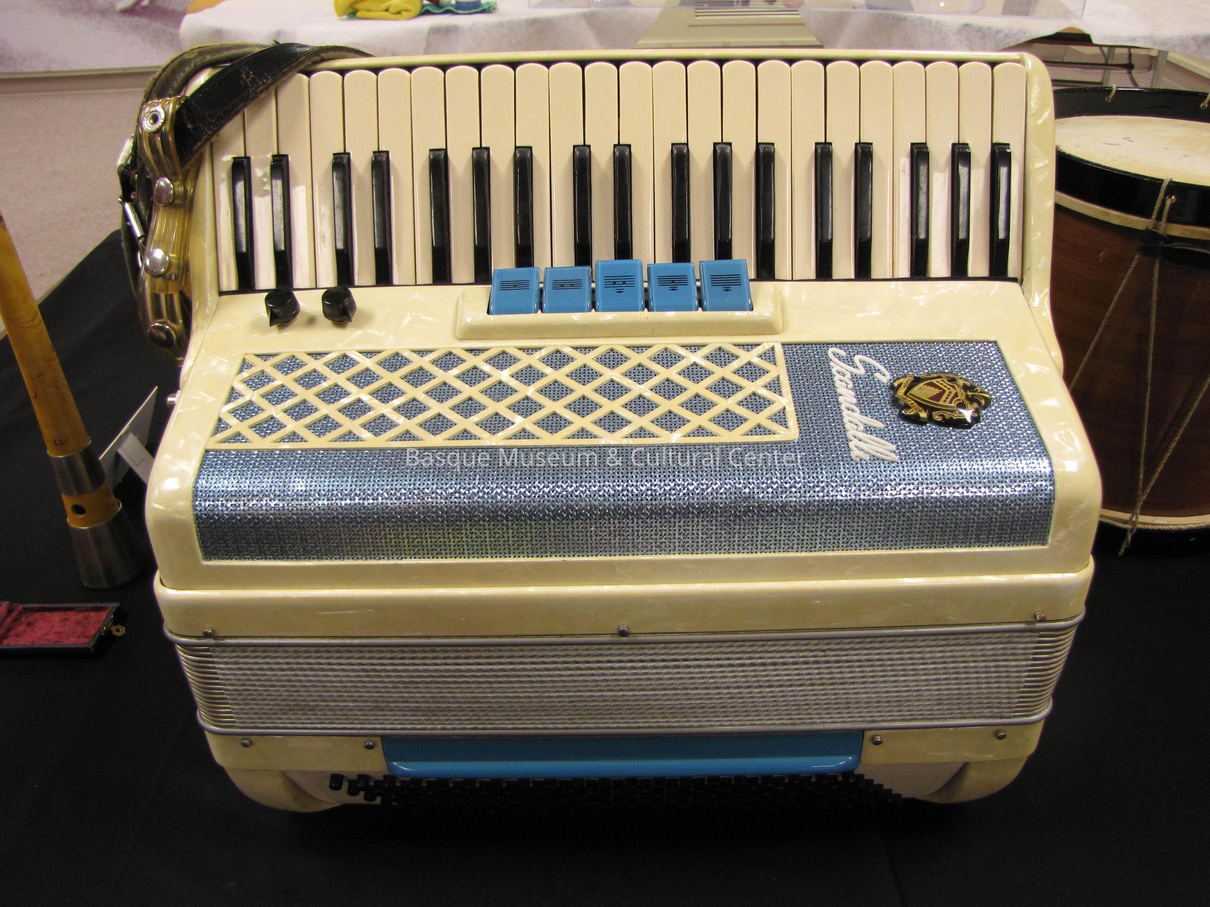 A: A keyboard accordion. Materials used in body include wood, metal and a pearly white celluloid/plastic and a blue celluloid/plastic. The body is a creamy white with sky blue accented keys and a solid blue portion just above the buttons. The grill is a sky blue foil(?) with the same creamy white celluloid/plastic in a cross hatch pattern. To the right of the cross hatch pattern is the manufacturer name and crest: "Scandalli" in white plastic with a maroon and brass colored shield above with the text: "Scandalli Italia." The bellows is edged in a silver metal but is mainly made of a cream cardboard. As a keyboard style accordion, there is a row of piano keys at the top made of black and white celluloid. This style is also known as a "120 bass" for the 120 small bass buttons at the bottom. These are known as a Stradella Bass System, or Standard Bass.
