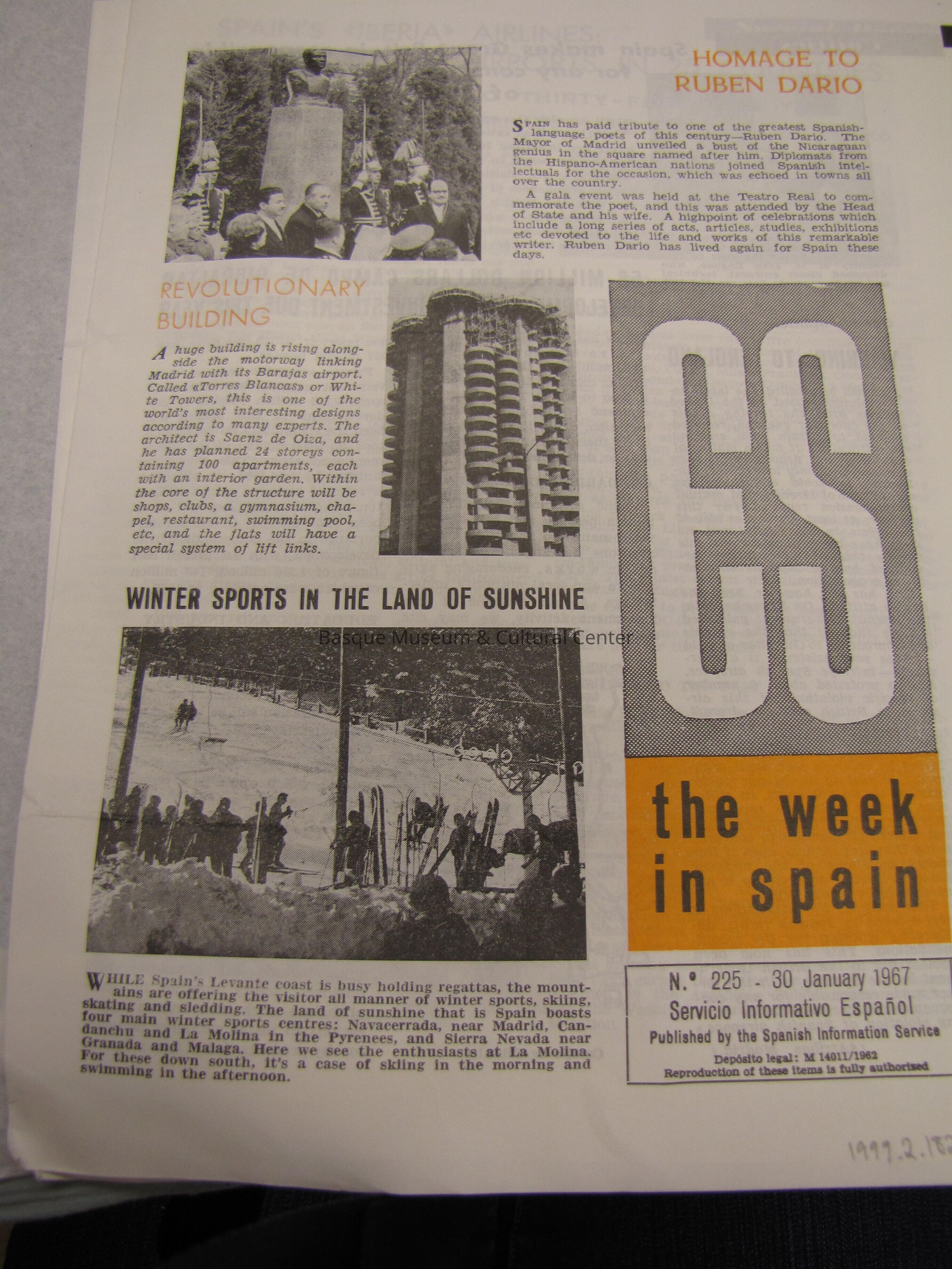 Magazine. Cover articles headlines in orange; "Homage to Ruben Dario" and "Revolutionary Building" . Logo on the bottom right corner. "The week in Spain" over orange background. The rest in black and white. Picture of a statue, a building, and a ski resort.