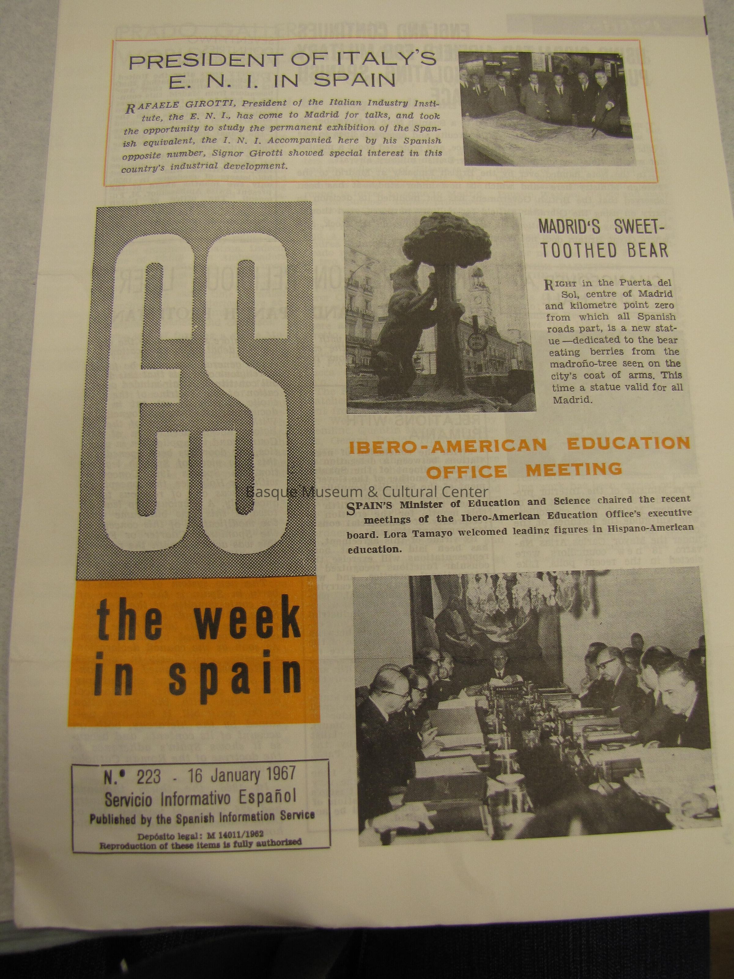 Magazine. Cover articles headlines in orange; President of Italy's E. N. I. in Spain" and "Ibero-American Education Office Meeting". Logo on the bottom left corner. "The week in spain" over orange background. The rest in black and white. Picture of a two meetings and a statue of a bear.