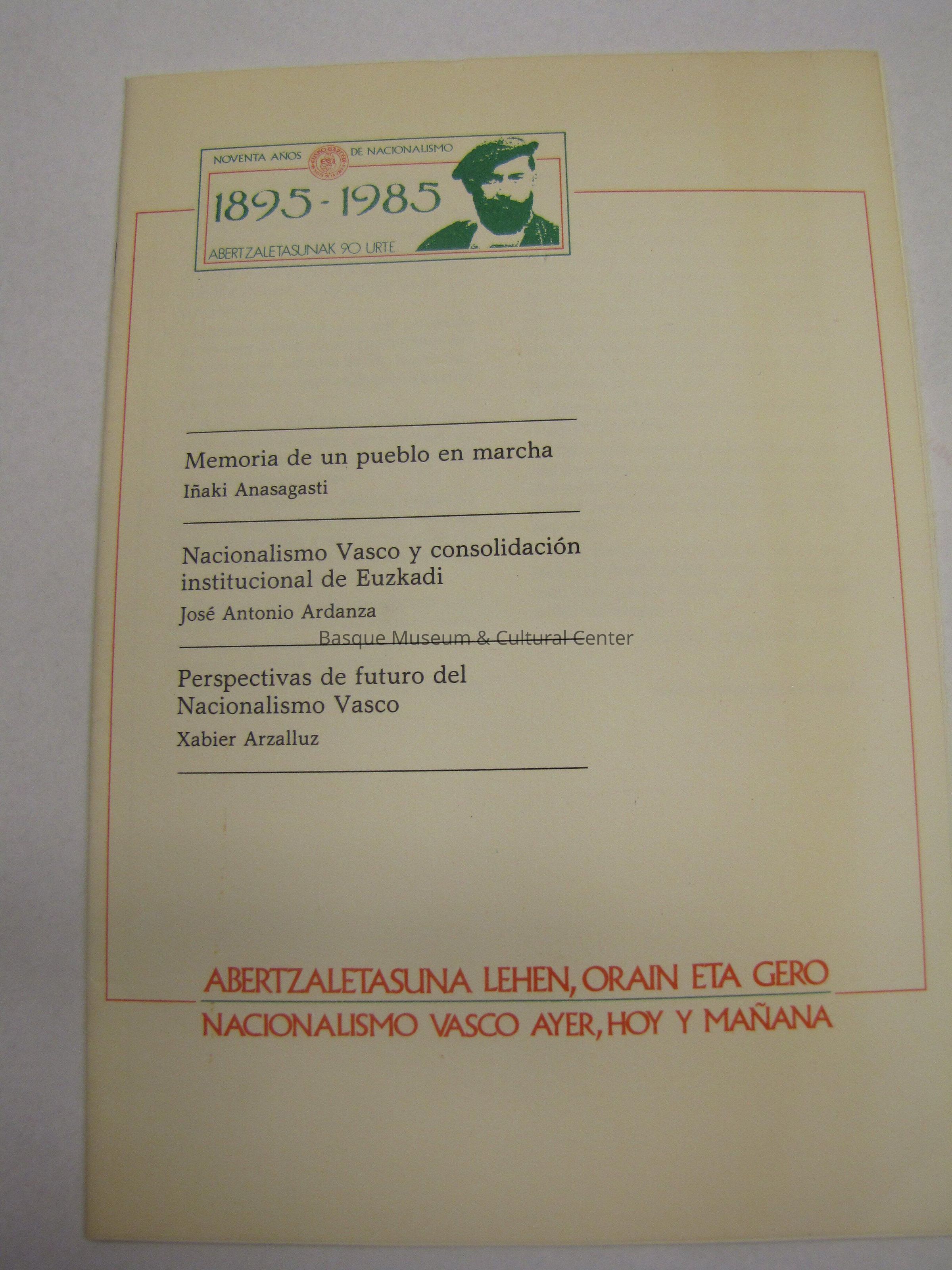 The top of the cover has a rectangle box with a Basque man and says 1895-1985 Noventa anos De Nacionalismo