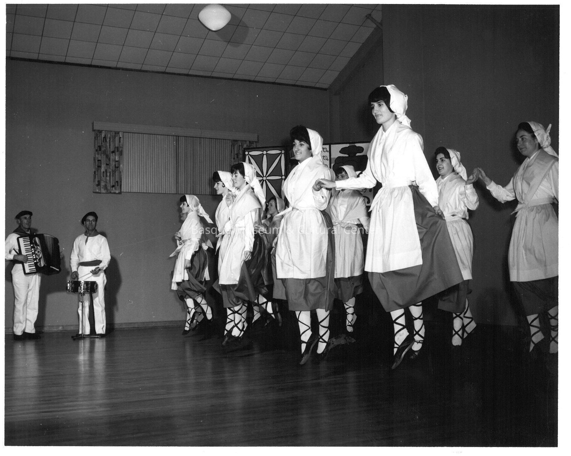 Copy of a black and white photo print, of Oinkari dancers. There are an estimated 2 men, one playing the accordian and other playing a snare drum, and an estimated 9 women dancing/performing while holding hands. At far left are Jim Jausoro and Domingo Ansotegui. Taken as the Basque Center in Boise.