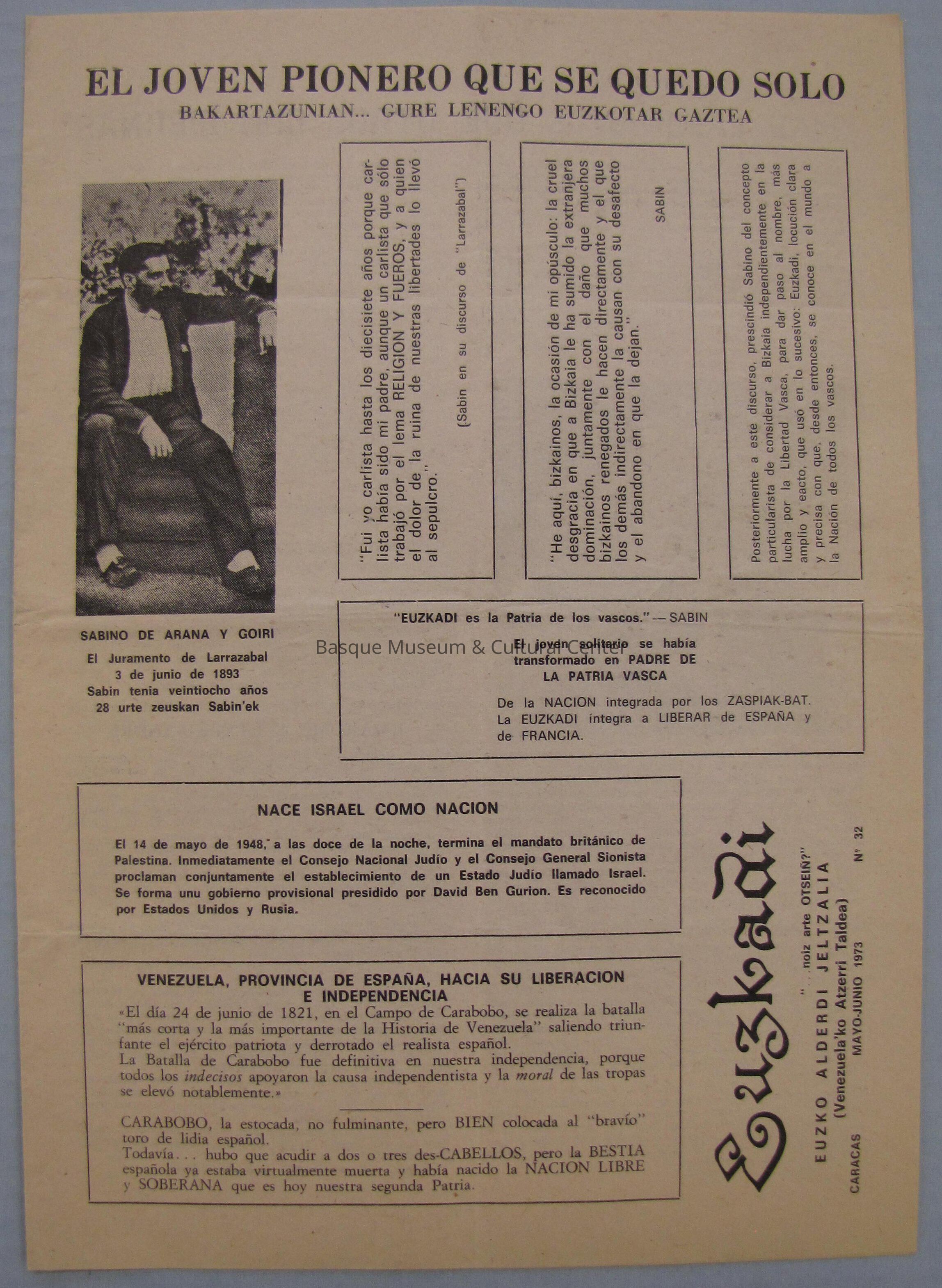 "Euzkadi" newsletter from Caracas, Venezuela; in the lower right corner of the cover page "Euzkadi/'...noiz arte Otsein?'/Euzko Alderdi Jeltzalia/(Venezuela'ko Atzerri Taldea)/Caracas Mayo-Junio 1973 No. 32" (Euskadi/...servants until when?/Basque Nationalist Party/Venezuela's foreign team/Caracas May-June 1973 No. 32) is vertically printed; cover heading reads "El joven pionero que se quedo solo" (The young pioneer that stayed alone) with its translation in Basque beneath; below the headline is a photo of Sabino Arana and several of his quotes, a paragraph about the foundations of Israel and about Venezuela being freed from Spain; page 2 has a story of Pedro Beitia who was a disabled yet dedicated patriot, an advertisement for a writing competition, and a short piece about Golda Meir and Basque women and ladies of the house; page 3 has a large article on politics, politicians, and demagogues, an advertisement for lunchtime meetings ("Amaiketako-Izketaldiak"), and a farewell to a priest; page 4 has a copy of a letter to Dr. Arturo Uslar Pietri, a letter about patriotism, and news from Buenos Aires, London, and Brussels; page 5 has an update on a loan from the Basque Government, a section called "!Dile a tu Padre...!" (Tell your father) with small updates, important dates, and quotes; page 6 has a letter from Pedro de Pagogana to Pedro Beitia about Public Relations in the United States and a small section titled "Empate a uno" (Tied at 1) with small tidbits of information.