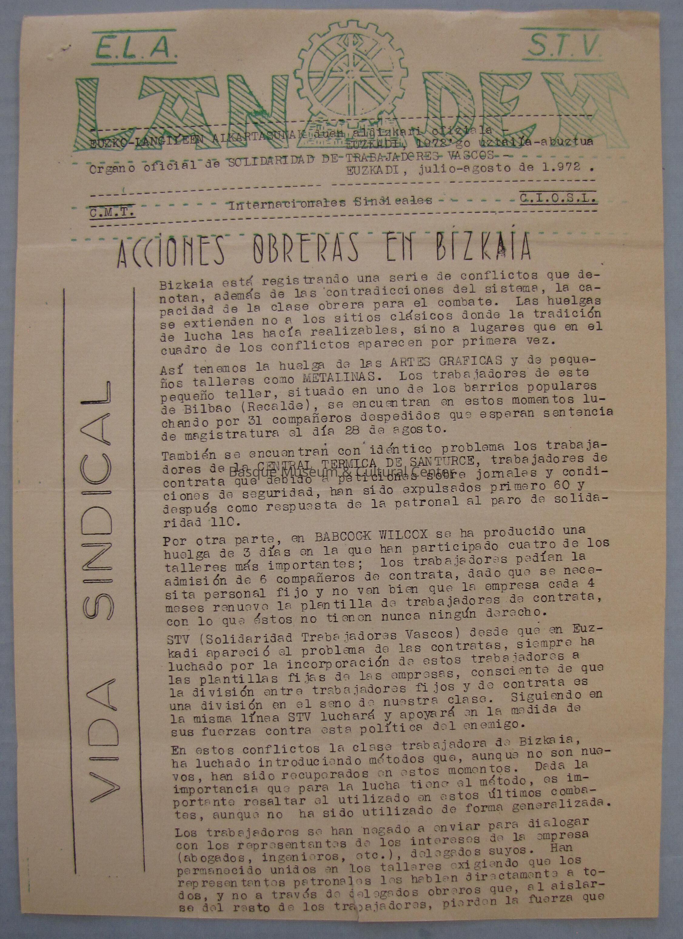 First 2 pages of Lan Deya newsletter; First page has a heading along the side which reads "Vida Sindical" (Union Life) and a subheading stating "Acciones Obreras en Bizkaia" (Workers' Actions in Bizkaia) the first article concerns a series of conflicts in Bizkaia which indicated the capacity of the working class, strikes are especially highlighted as effective; on the back of the page there is a small mention of a strike in Hernani, Gipuzkoa of workers for Orbegozo y Cia which it says is continued on page 4, though it is not included.