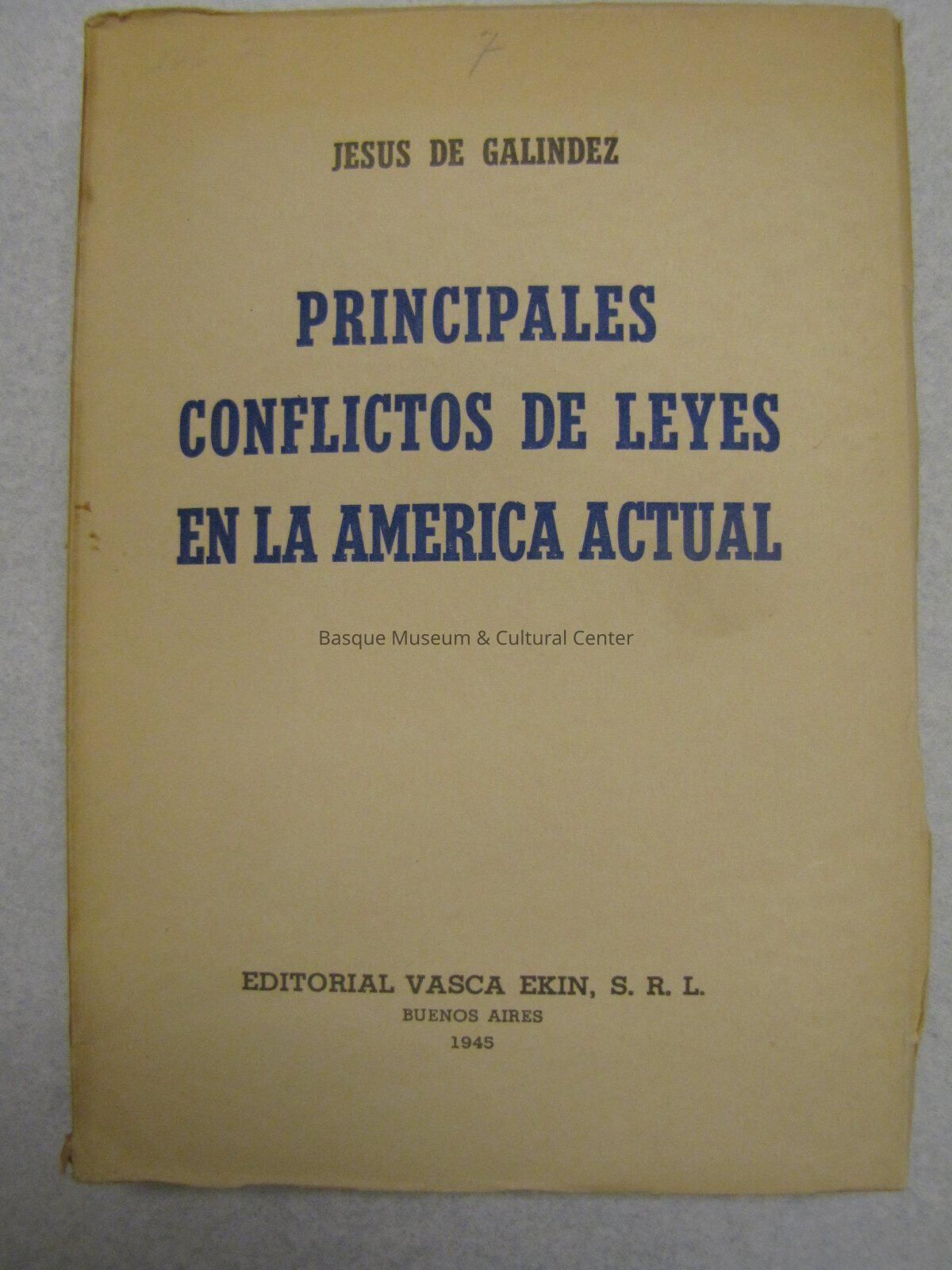 "Major conflict of laws in America today." Half of the book is a bibliography or catalogue of references. Pages are brown. Cover is off-white. TItle in blue ink. Author and publisher in black. Sticker on back, "Edicion Argentina"
