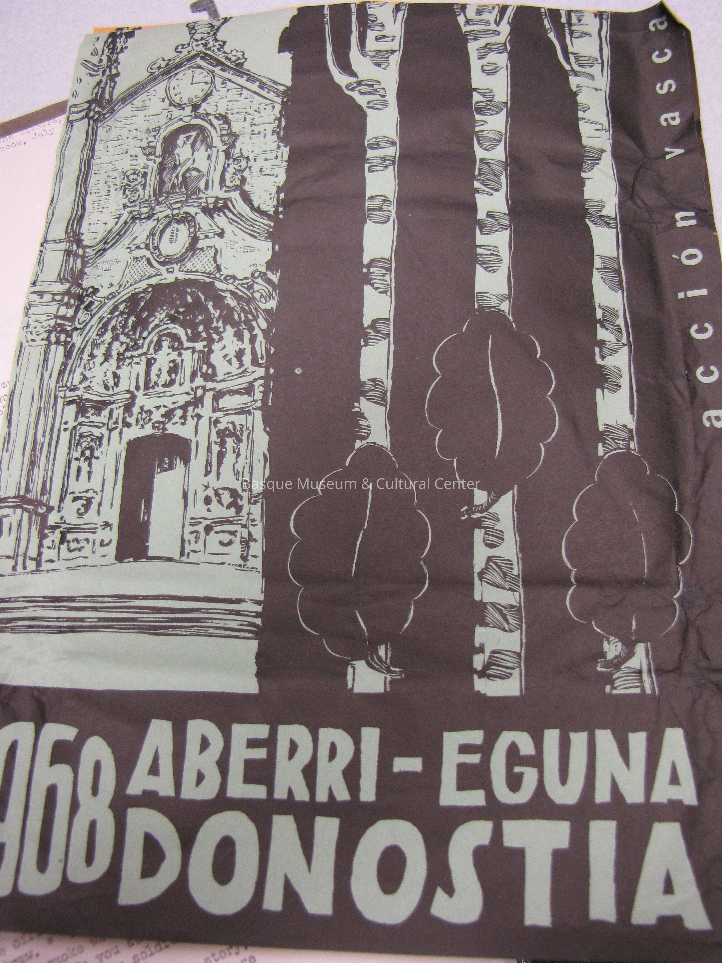 Poster of an event Acion Vasca 1968 Aberri-Eguna Donostia Black and light green, a building in green with the rest black and tress in green and font.