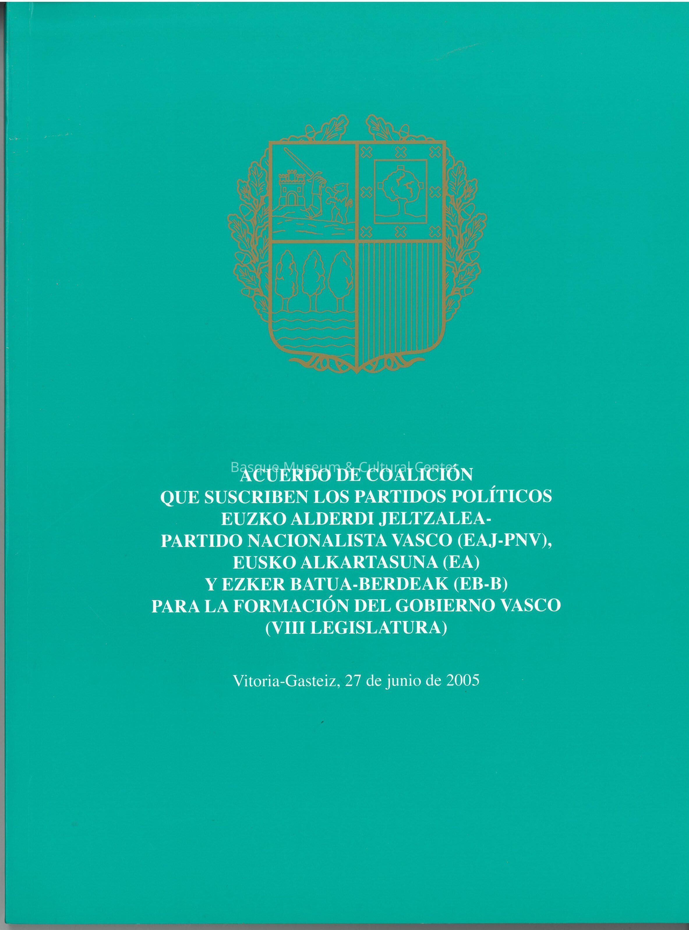 Full title: Acuerdo de coalicio´n que suscriben los partidos poli´ticos Euzko Alderdi Jeltzalea-Partido Nacionalista Vasco (EAJ-PNV), Eusko Alkartasuna (EA) y Ezker Batua-Berdeak (EB-B) para la formacio´n de un gobierno (VIII Legislatura) : Vitoria-Gasteiz, 27 de junio de 2005.