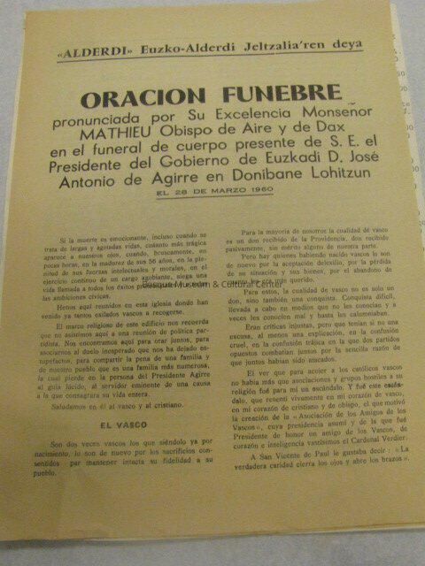 Headline: Oracion Fenubre pronunciada por Su Excelencia Monsenor Mathieu obispo de Aire y de Dax Funeral de cuerpo presente de S.E. el Presidente del Gobierno de Euzkadi D. Jose Antonio de Agiree en Donibane Lohitzun
