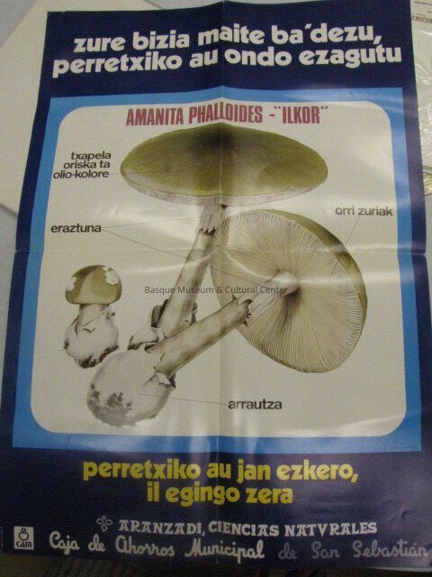 It's a dark blue back ground with white and yellow text and light bule right outside of the mushroom picture which has a white background. There are three different mushrooms all with labels. The top says "zure bizia maite ba'dezu, perretxiko au ondo ezagutu" The labels are "txapela oriska ta olio-kolore, orri zuriak, eraztuna, and arrautza" Below the picture "perretziko au jan ezkero, il egingo zera" "aranzadi, ciencias natvrales" caja de ahorros municipal de San Sebastian.