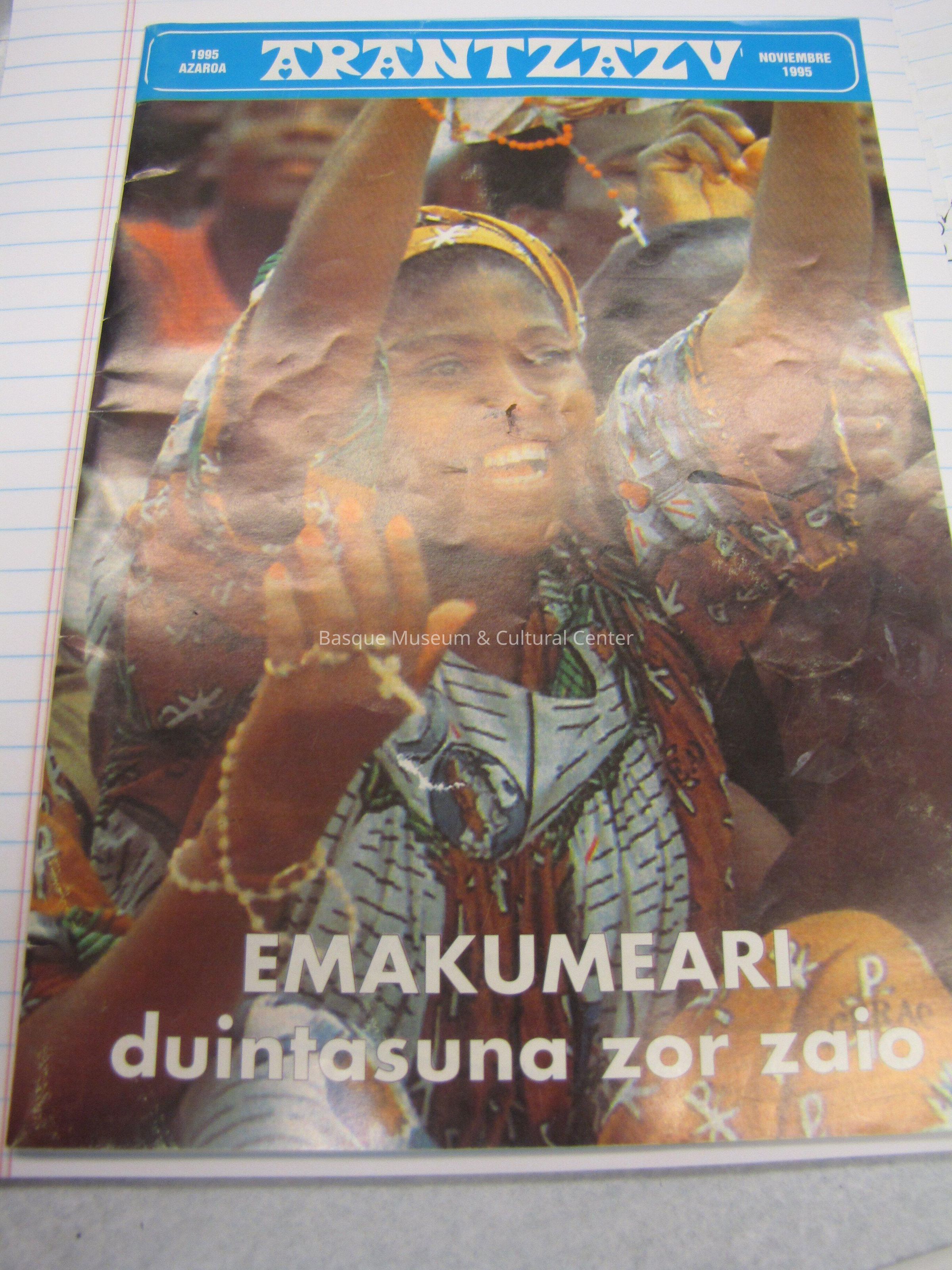 This magazine is 32 pages long and smaller than a standard size. The pages are all in colors like light pink, yellow, and blue. The front cover has a picture of an African woman with traditional clothing on a holding up a rosary. The title is white font on a blue strip.