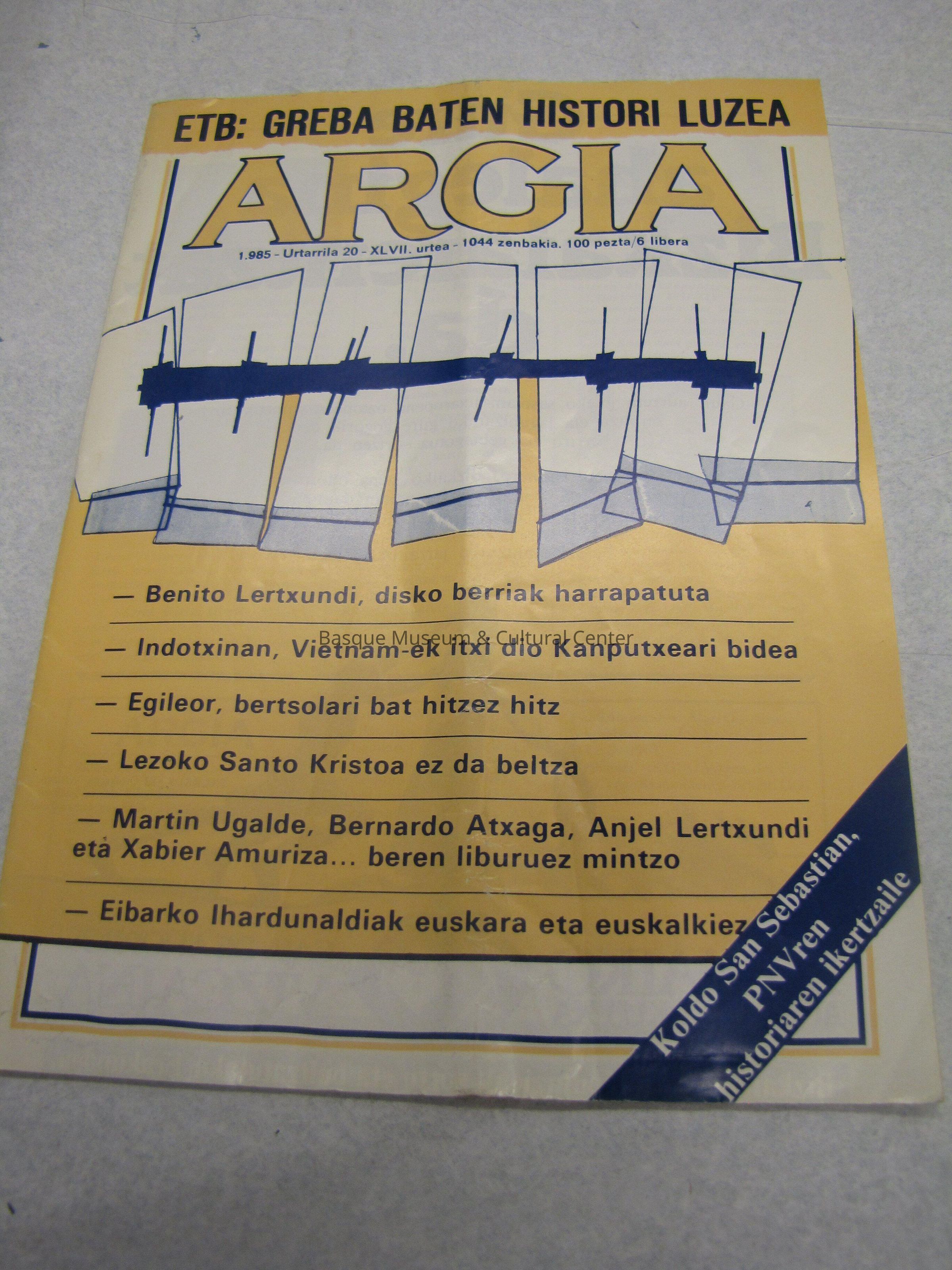 Argia 1985 Urtarrila 20-XLVII. Urtea 1044 Xenbakia. 100pezta/ 6libera