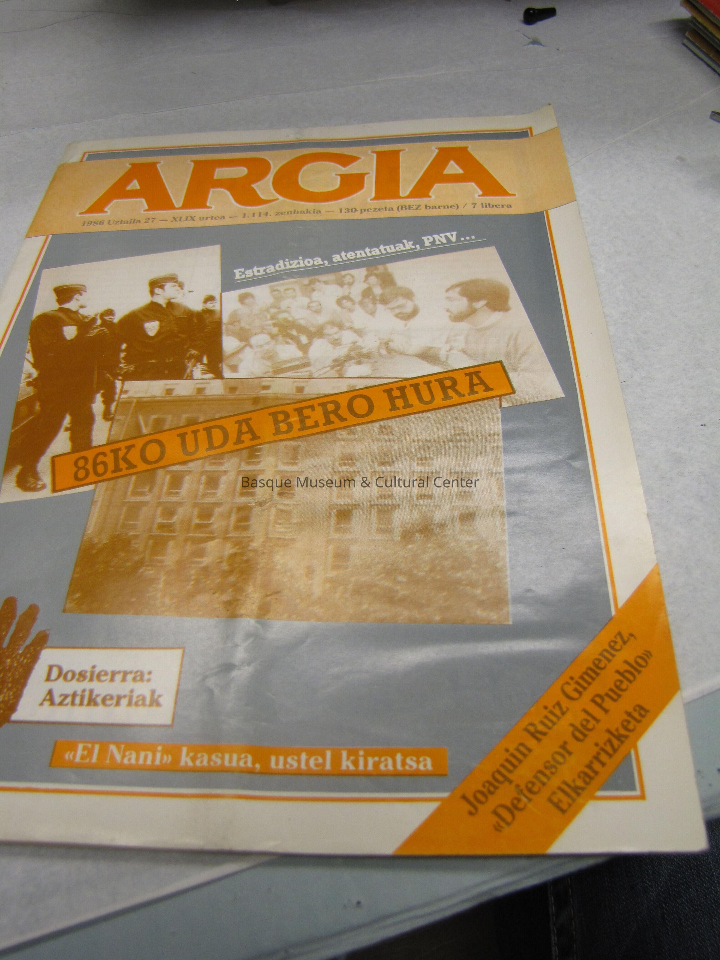 Argia 1986 Uztaila 27- XLIX. urtea- 1.114., Zenbakia- 130 pezeta(BEZ barne) /7 libera