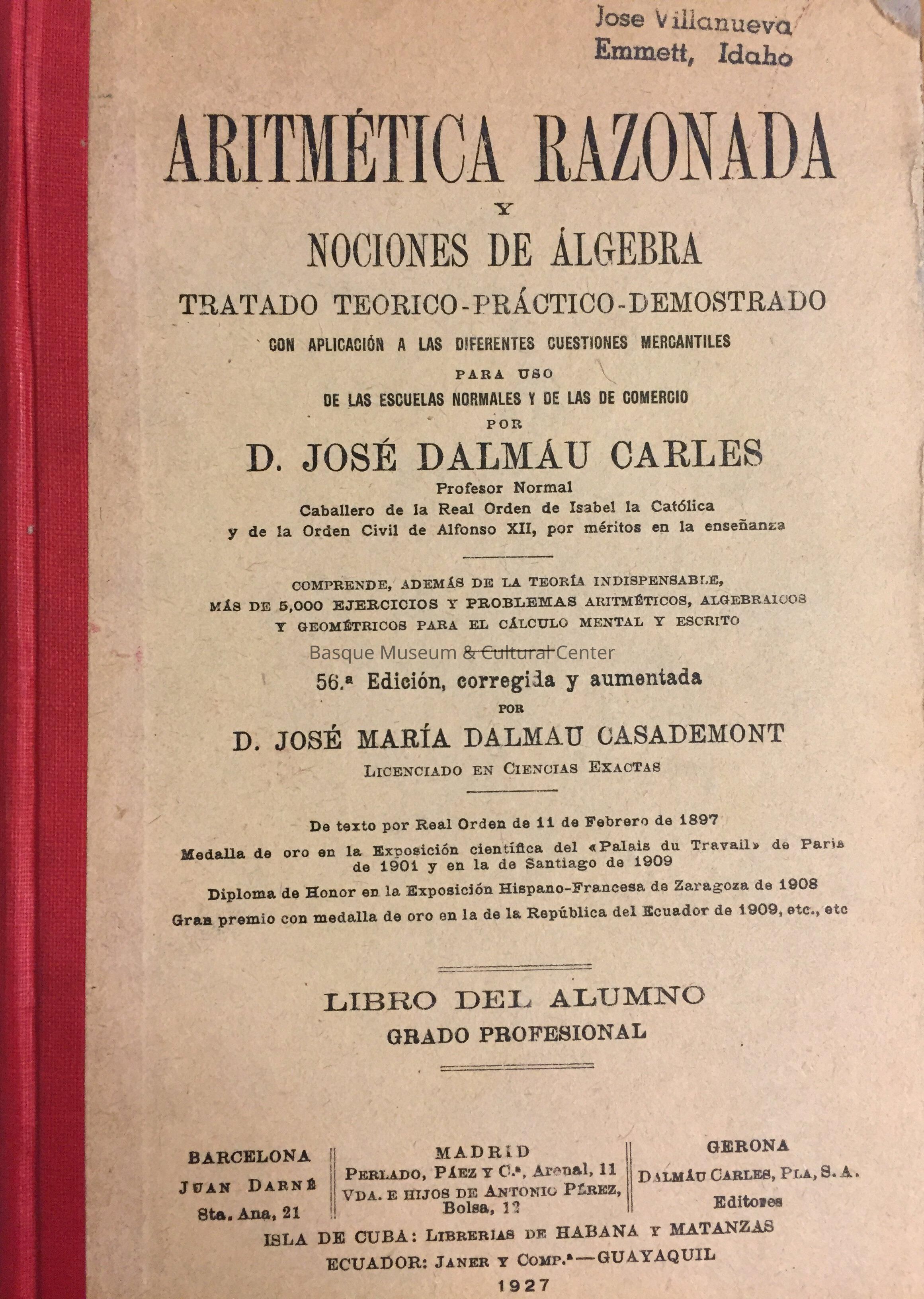 Aritmetica razonada y nociones de algebra : tratado teorico-practico-demostrado con aplicacon a las diferentes cuestiones mercantiles para uso de las escuelas normales y de las de comercio. Libro del alumno, Grado profesionalEntry/Object ID