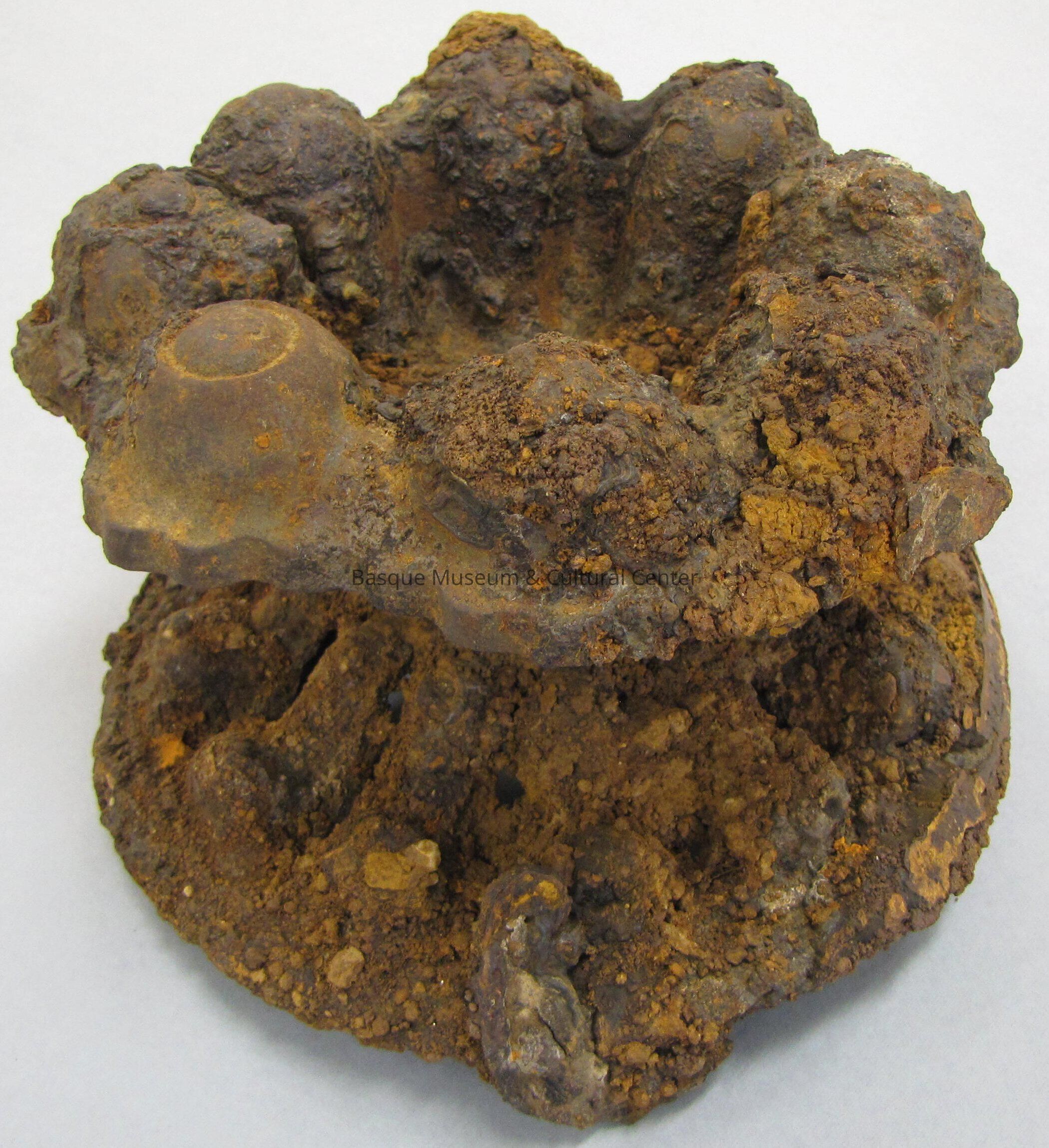 Unidentified metal hardware consisting of circular metal formations connected by a bolt and nut; one has scalloped edges; can rotate on the bolt; possibly part of the stove or heater; covered with orange and dark-brown oxidation.